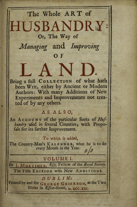 The whole art of husbandry, or, The way of managing and improving of land : being a full collection of what hath been writ, either by ancient or modern authors ... ; as also an account of the particular sorts of husbandry used in several counties ... ; to which is added the country-man's kalendar / by J. Mortimer (Dublin : Printed by and for George Grierson, 1721). The fifth edition, with new additions.
