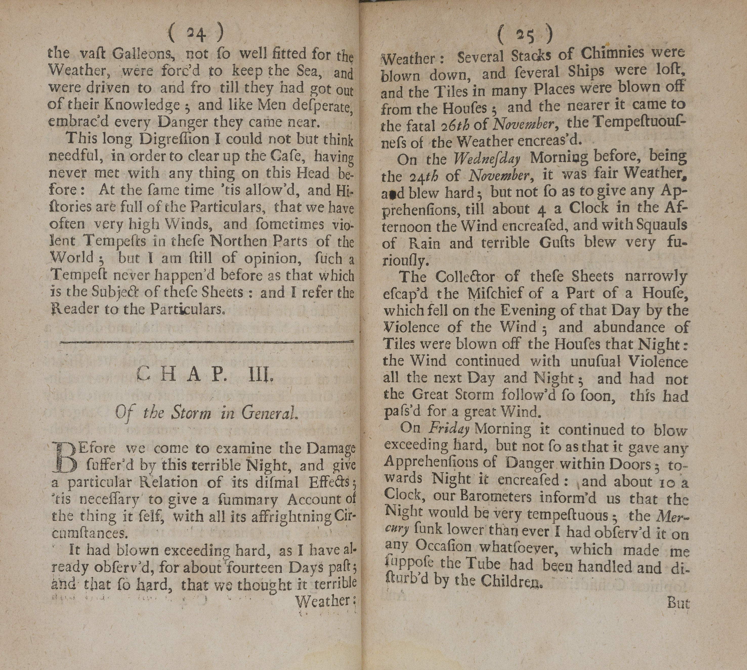 On Wednesday 26 November 1703, Daniel Defoe nearly died near his London home when part of a neighbouring house collapsed in a week-long hurricane that hit the south of England and the English Channel. Regarded as the first substantial work of modern journalism, he published this book the following year, after advertising in the London Gazette for eyewitness accounts. In sharp contrast to ‘clinical’ colonial reports of weather disasters, Defoe foregrounds stories of courage, selfishness and suffering by those who experienced the Great Storm.