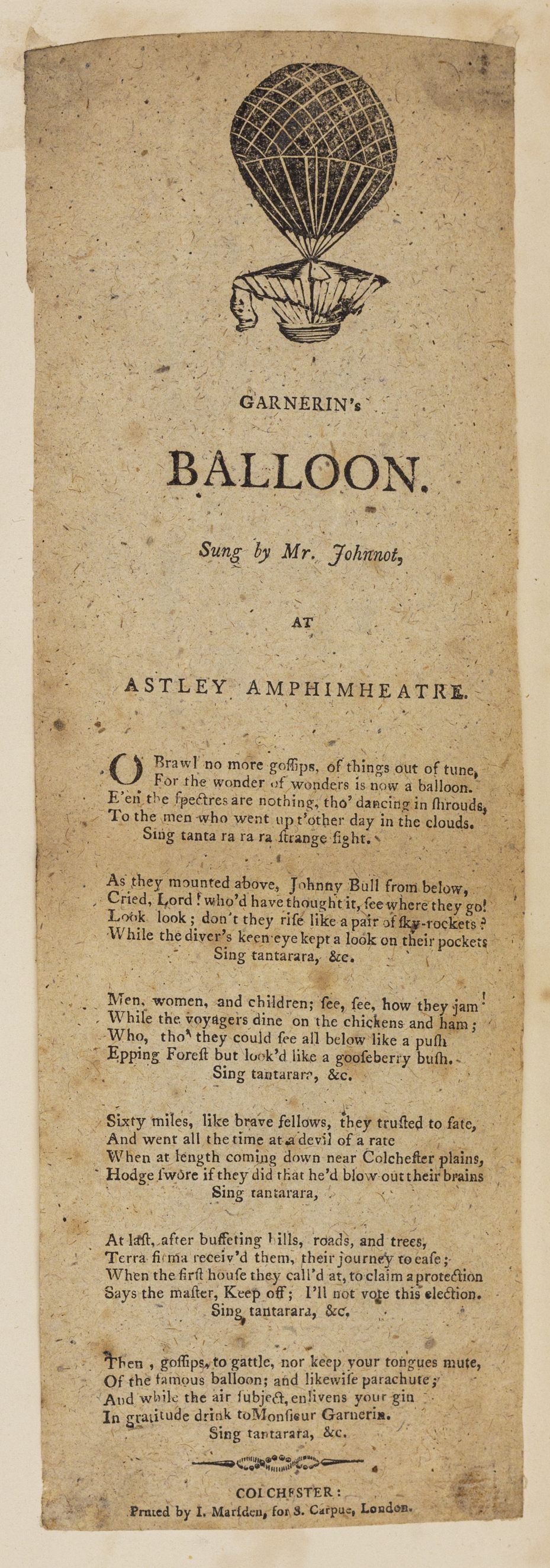 GARNERIN's BALLOON. Sung by Mr. Johnnot, AT ASTLEY AMPHIMHEATRE. of For the wonder of wonders is now a balloon. E'en the fpectres are nothing, tho' dancing in fhrouds, To the men who went up t'other day in the clouds. Sing tanta ra ra ra ftrange fight. As they mounted above, Johnny Bull from below, Cried, Lord! who'd have thought it, fee where they go! Look look; don't they rife like a pair of fky-rockets? While the diver's keen eye kept a look on their pockets Sing tantarara, &cc. Men, women, and children; fee, fee, how they jam While the voyagers dine on the chickens and ham; Who, tho they could fee all below like a pufh Epping Foreft but look'd like a goofeberry bufh.- Sing tantarare, &c. Sixty miles, like brave fellows, they trufted to fate, And went all the time at a devil of a rate When at length coming down near Colchefter plains, Hodge fwore if they did that he'd blow out their brains Sing tantarara, At laft, after buffeting hills, roads, and trees, Terra firma receiv'd them, their journey to eafe; When the first houfe they call'd at, to claim a protection Says the maſter, Keep off; I'll not vote this election. Sing tantarara, &c, Then, goffips, to gattle, nor keep your tongues mute, Of the famous balloon; and likewife parachute; And while the air fubject, enlivens your gin In gratitude drink to Monfieur Garnerin. Sing tantarara, &c. CHIL COLCHESTER: Prated by I. Mariden, for S. Carpue, London.