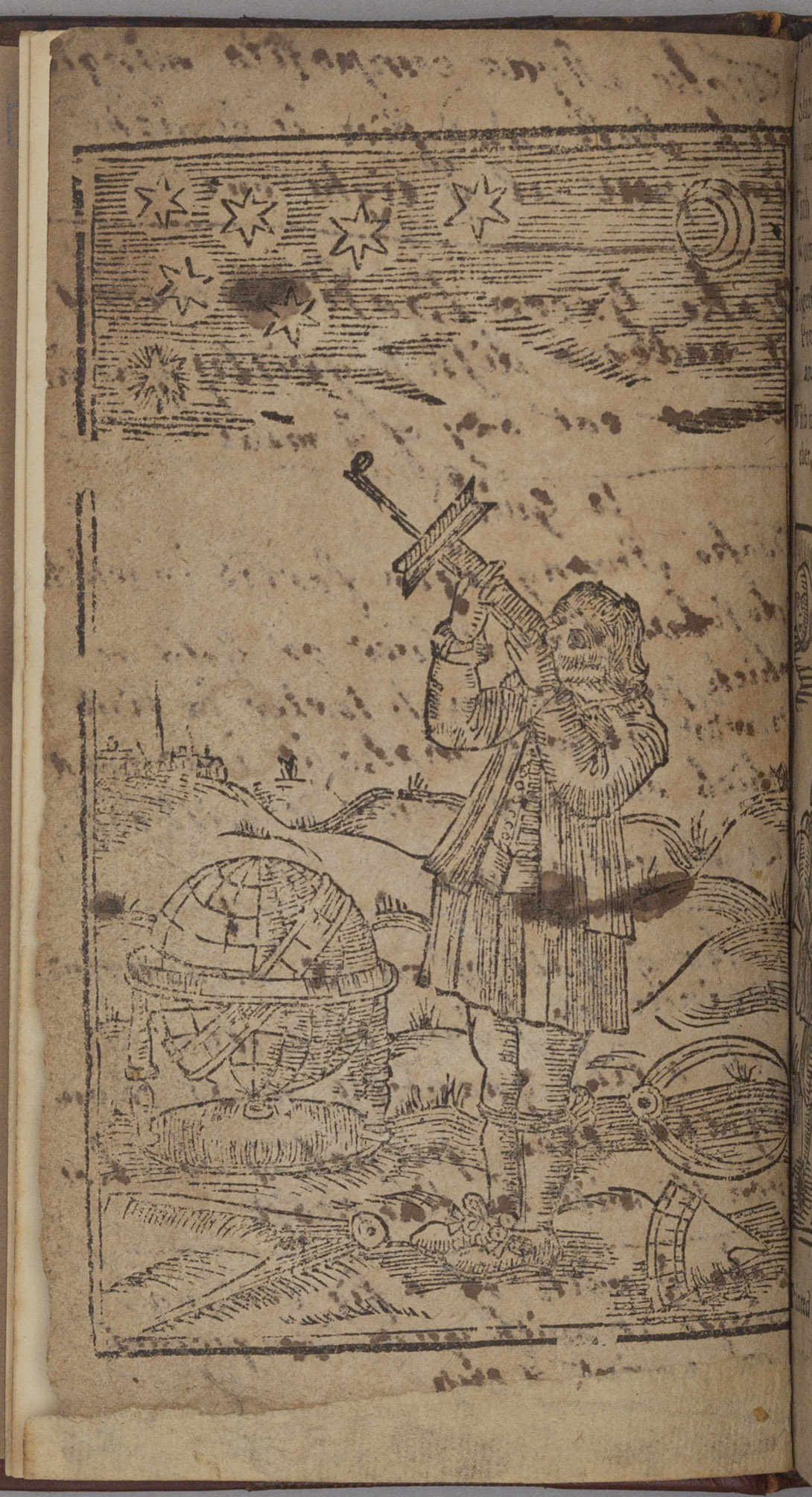 Weather lore and knowledge were disseminated in books such as The Knowledge of Things Unknown which has this woodcut image on its title page. It shows a figure looking up for guidance to the ancient Greek scholar Claudius Ptolemy who had a significant impact on mathematical and astronomical thinking in medieval and early modern Europe. The text compiles theories on the origin of different weather phenomena and gives guidance on how its user might “read” them with help of knowledge passed down by “ancient authorities”.