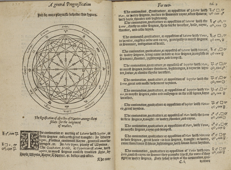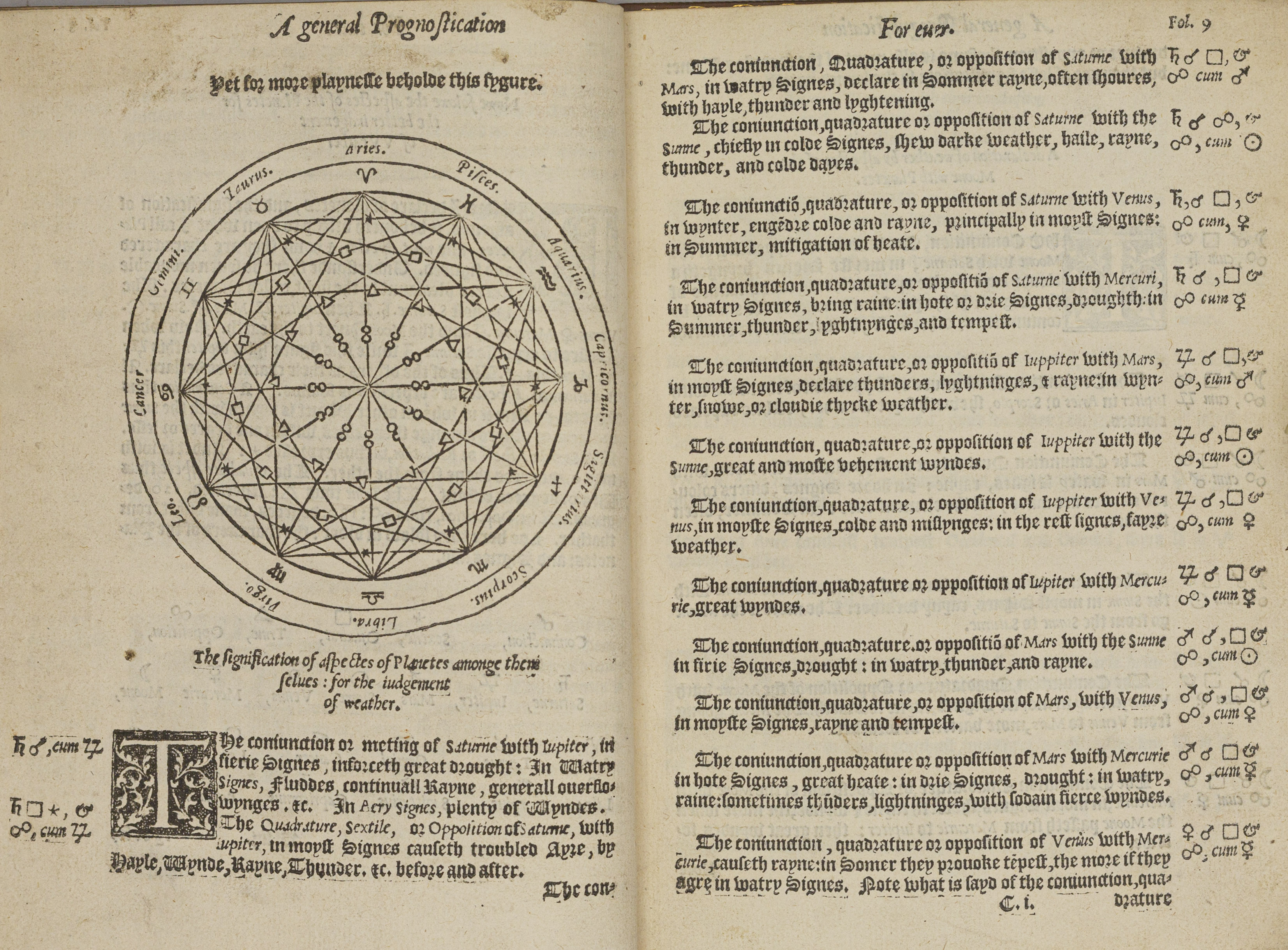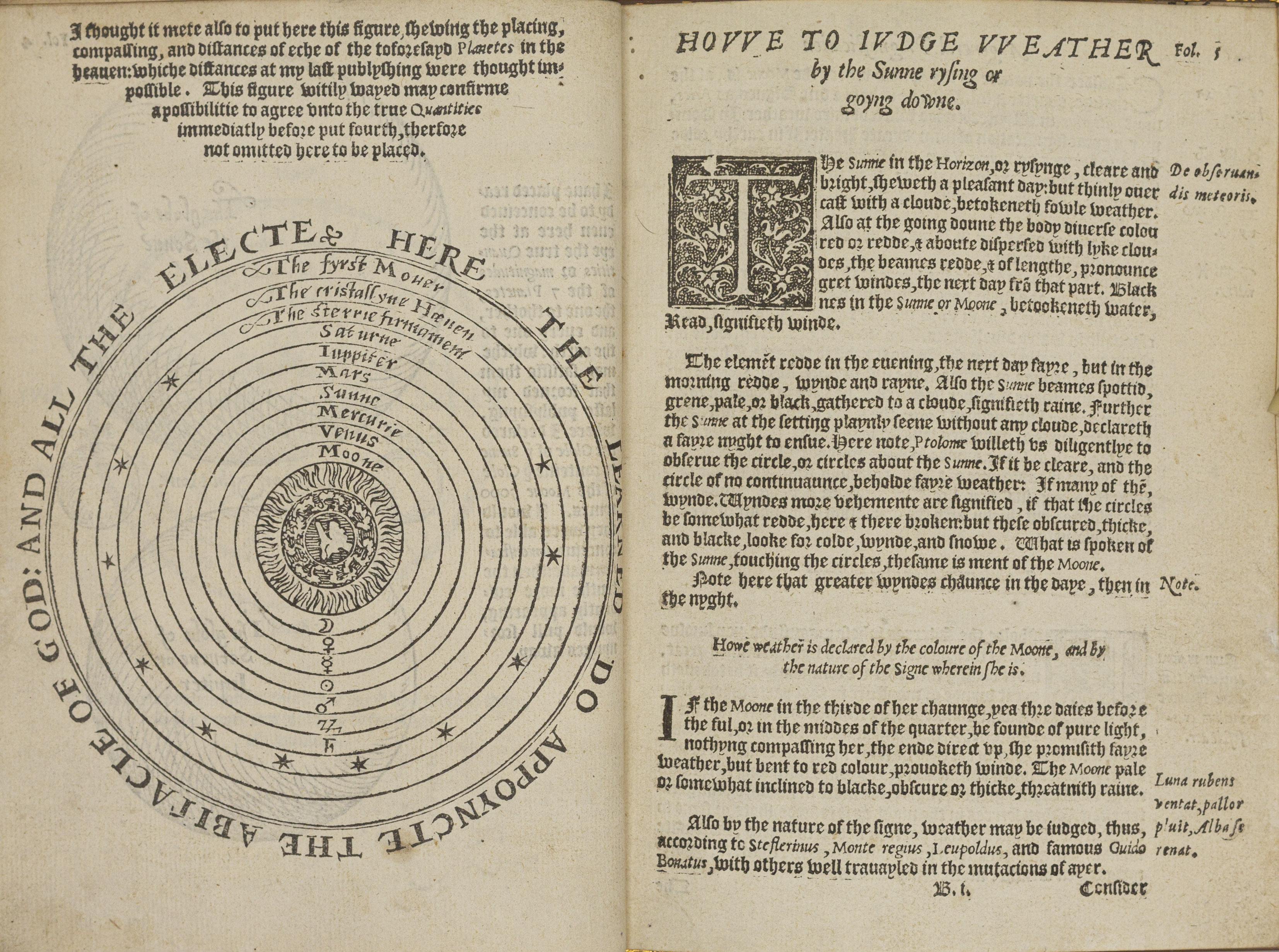 The second impression augmented by the author, printed by Thomas Gemini & Co London, 1556 [D.-L.L.] M⁰ [Digges] SR Countless generations have studied the sky to understand and predict the weather. This text by the mathematician Leonard Digges includes ways of forecasting through the planets’ positions and conjunctions. It is an example of ‘astro-meteorology’, which combined contemporary knowledge of astrology, astronomy and weather folklore. Although such thinking was dismissed as magical even by some of its contemporaries, it used table calculations and paper instruments which resembled later scientific methods. Contemporary science accepts that other planets affect the Earth but what that means for the weather is still not entirely understood.