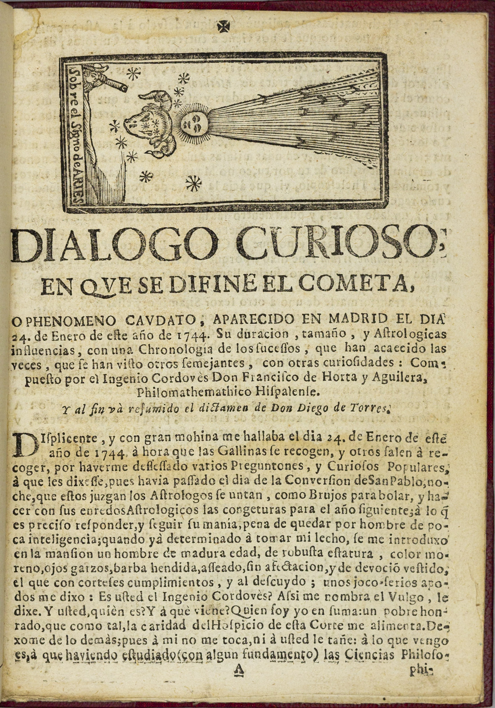 Francisco de Horta y Aguilera (18th century) Dialogo Curioso en que se Define el Cometa o Phenomeno Caudato Aparecido en Madrid el dia 24 de Enero de este Año de 1744, (Curious Dialogue in which the Comet or Caudate Phenomenon that Appeared in Madri
