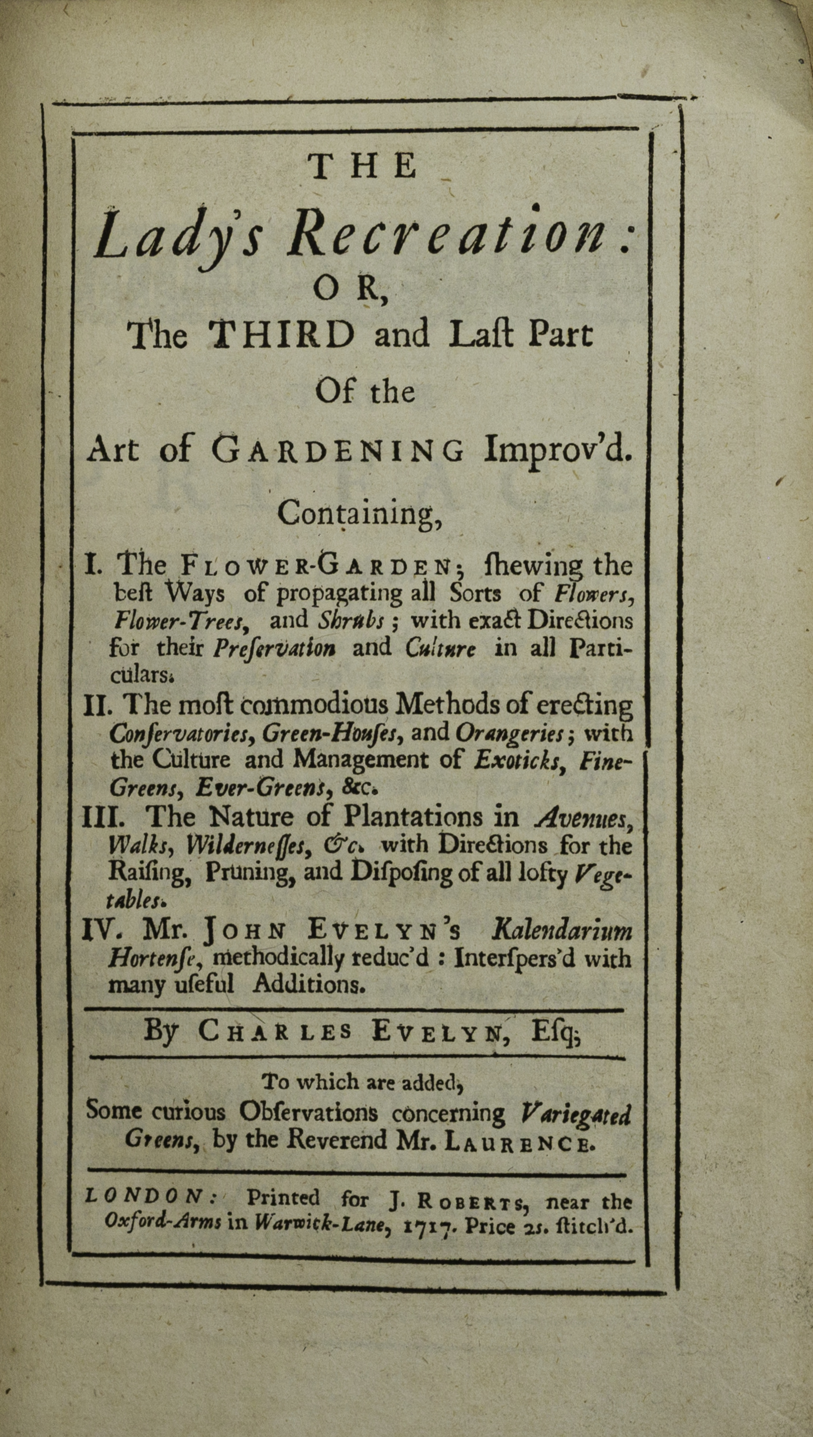- The lady's recreation, or, The third and last part of the art of gardening improv'd / by Charles Evelyn ... : to which are added some curious observations concerning variegated greens by the Reverend Mr. Laurence (London : Printed for J. Roberts, 1717).