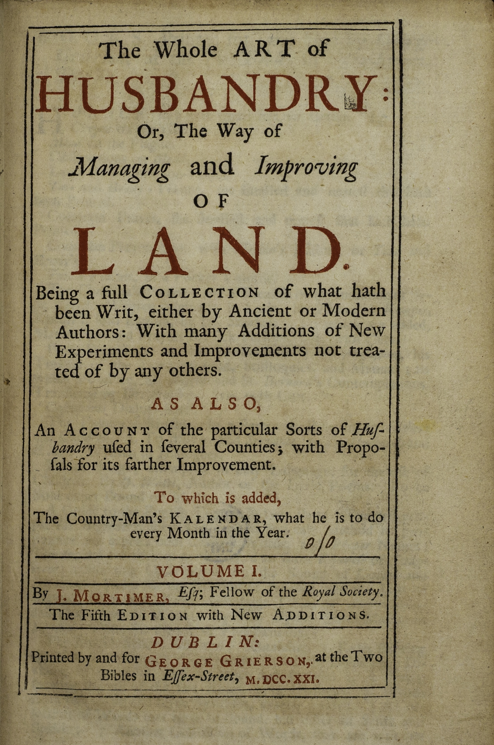 The whole art of husbandry, or, The way of managing and improving of land : being a full collection of what hath been writ, either by ancient or modern authors ... ; as also an account of the particular sorts of husbandry used in several counties ... ; to which is added the country-man's kalendar / by J. Mortimer (Dublin : Printed by and for George Grierson, 1721). The fifth edition, with new additions.