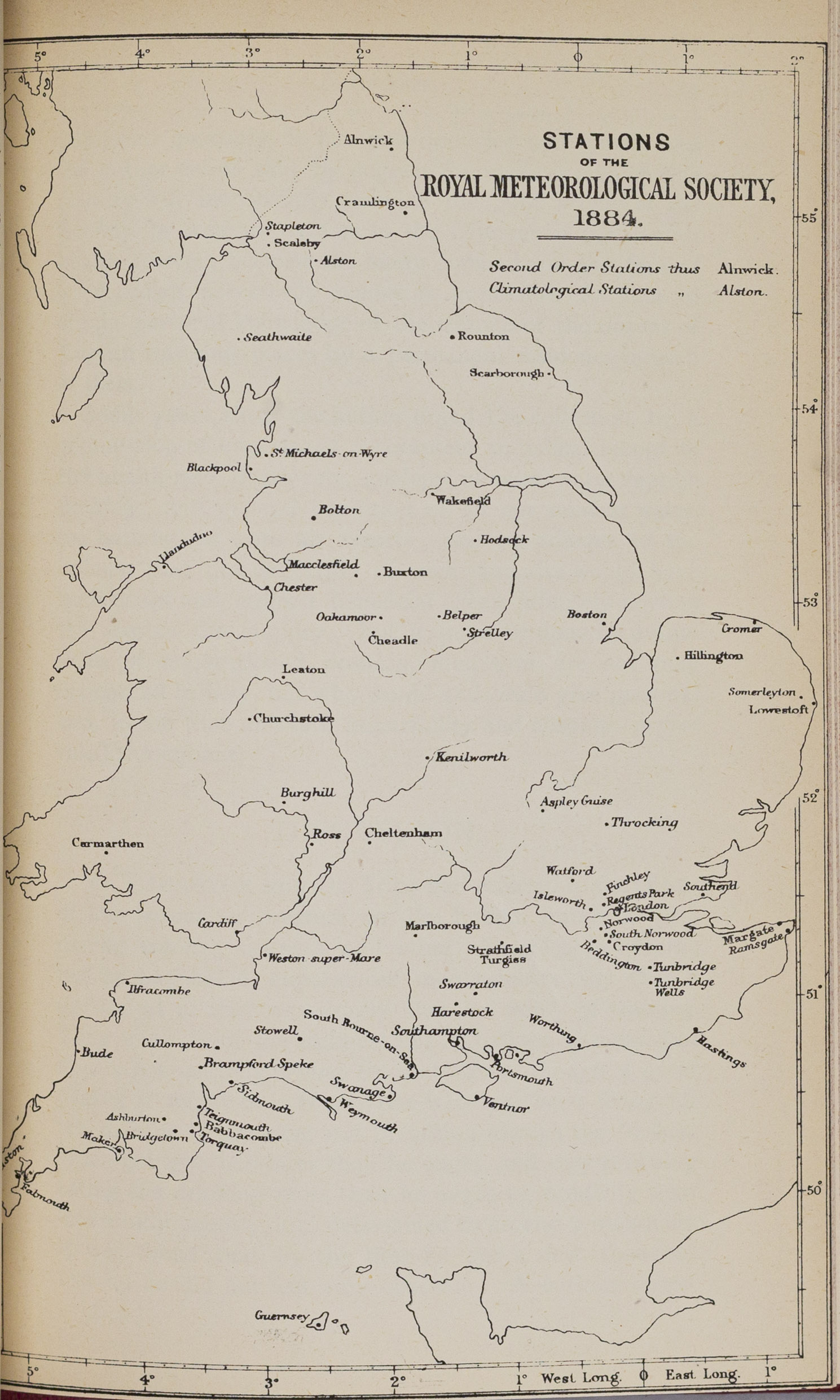 Published by William Clowes and Sons for the Executive Council of the International Health Exhibition, and for the Council of the Society of Arts, 1884 [G.L.] B.884 [International] The Royal Meteorological Society’s participation in the International Health Exhibition of 1884 reaffirmed the understanding of the interrelation of health and weather. Besides weather forecasting, the Society set up 82 climatological stations, as shown in this chart, in order to to understand the health implications of different weather conditions, including moisture levels in English seaside towns. The Society also encouraged public participation by displaying a model of a climatological station on the Exhibition’s grounds for “those desirous of organising a station”.