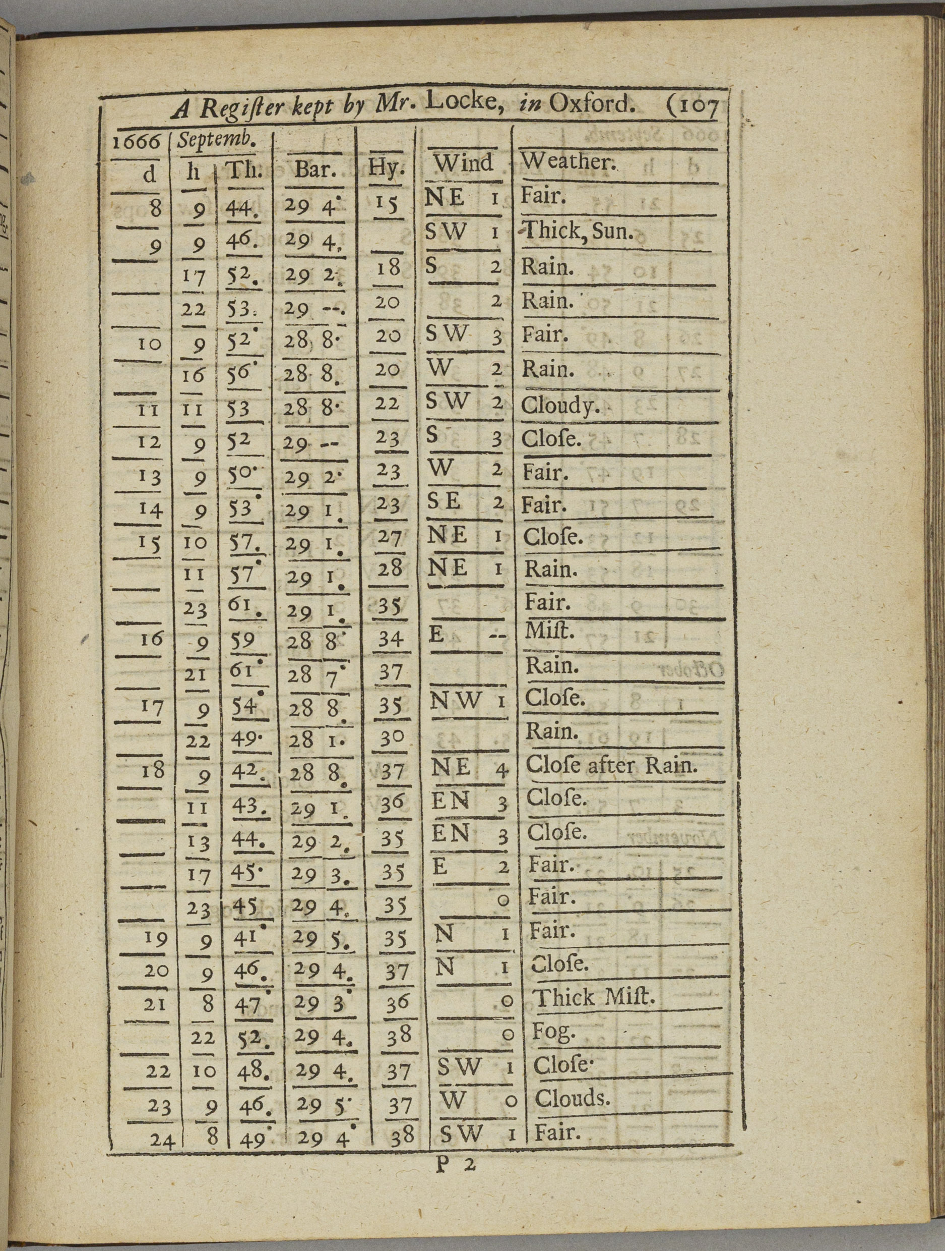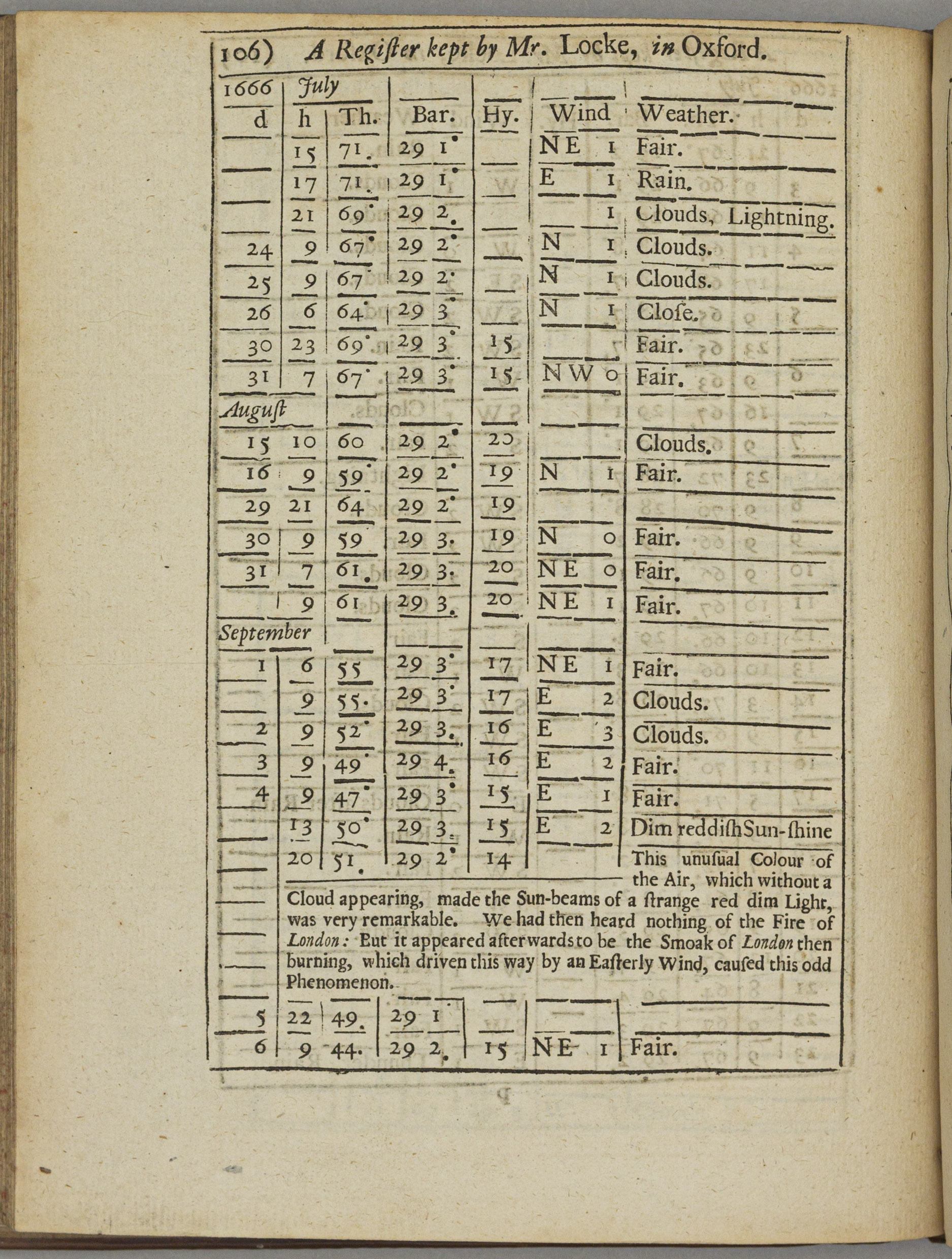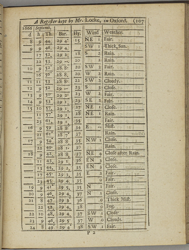 Standardised weather diaries were the answer to weather's elusiveness for the 17th century thinkers who embraced the experimental scientific method according to which data recording and analysis was essential for acquiring knowledge. One of the first modern chemists Robert Boyle persuaded his friend and fellow empiricist philosopher John Locke to start a weather diary in June 1666 with consistent recordings of atmospheric measurements such as temperature and pressure. On 4 September, Locke observed a “dim reddish sunshine” in Oxford, unknowingly describing the effects of the devastating Great Fire of London, which had started two days earlier.