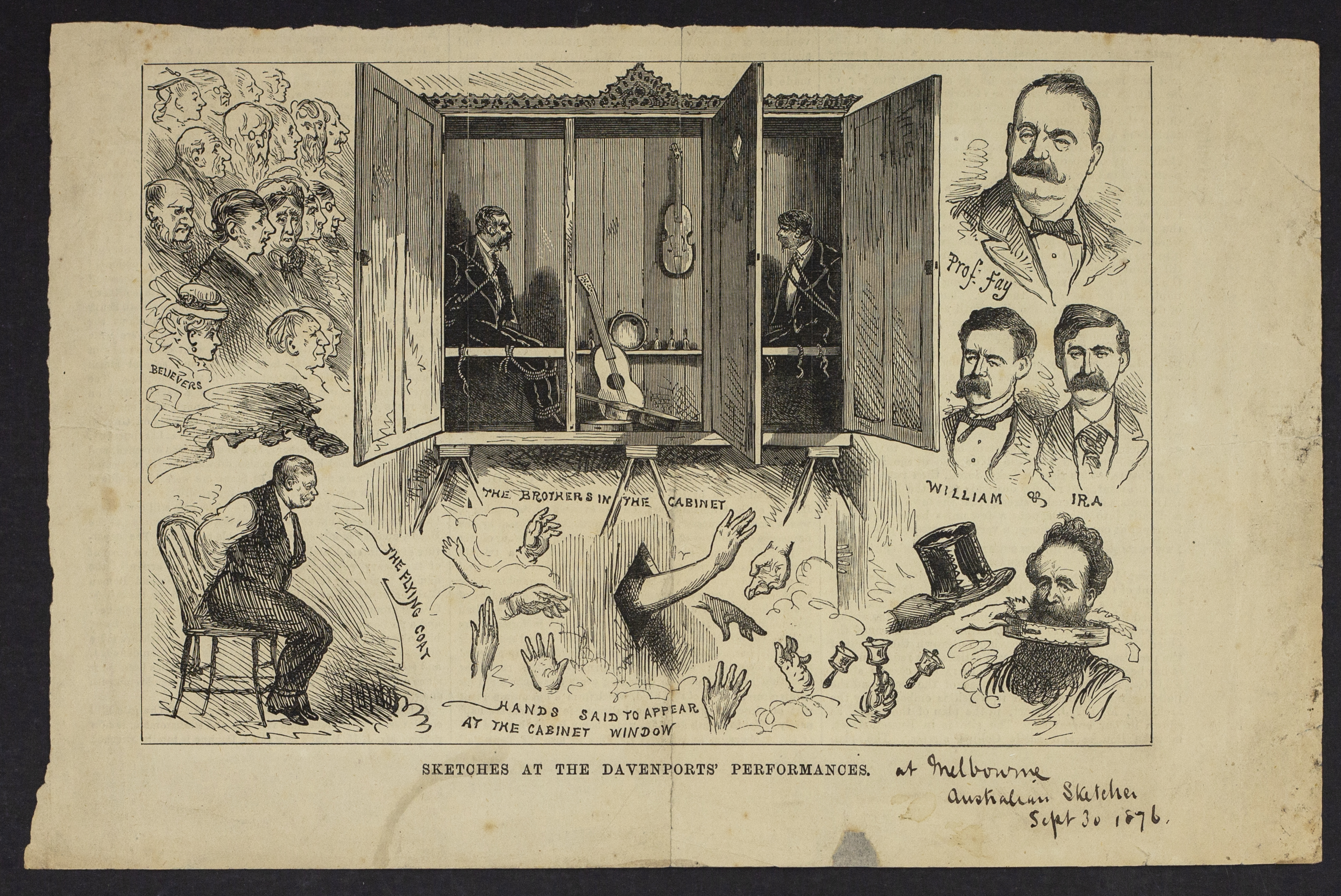 'Sketches at the Davenports' Performances', showing a sketch of the brothers, their performance and the crowd, sketched at Melbourne