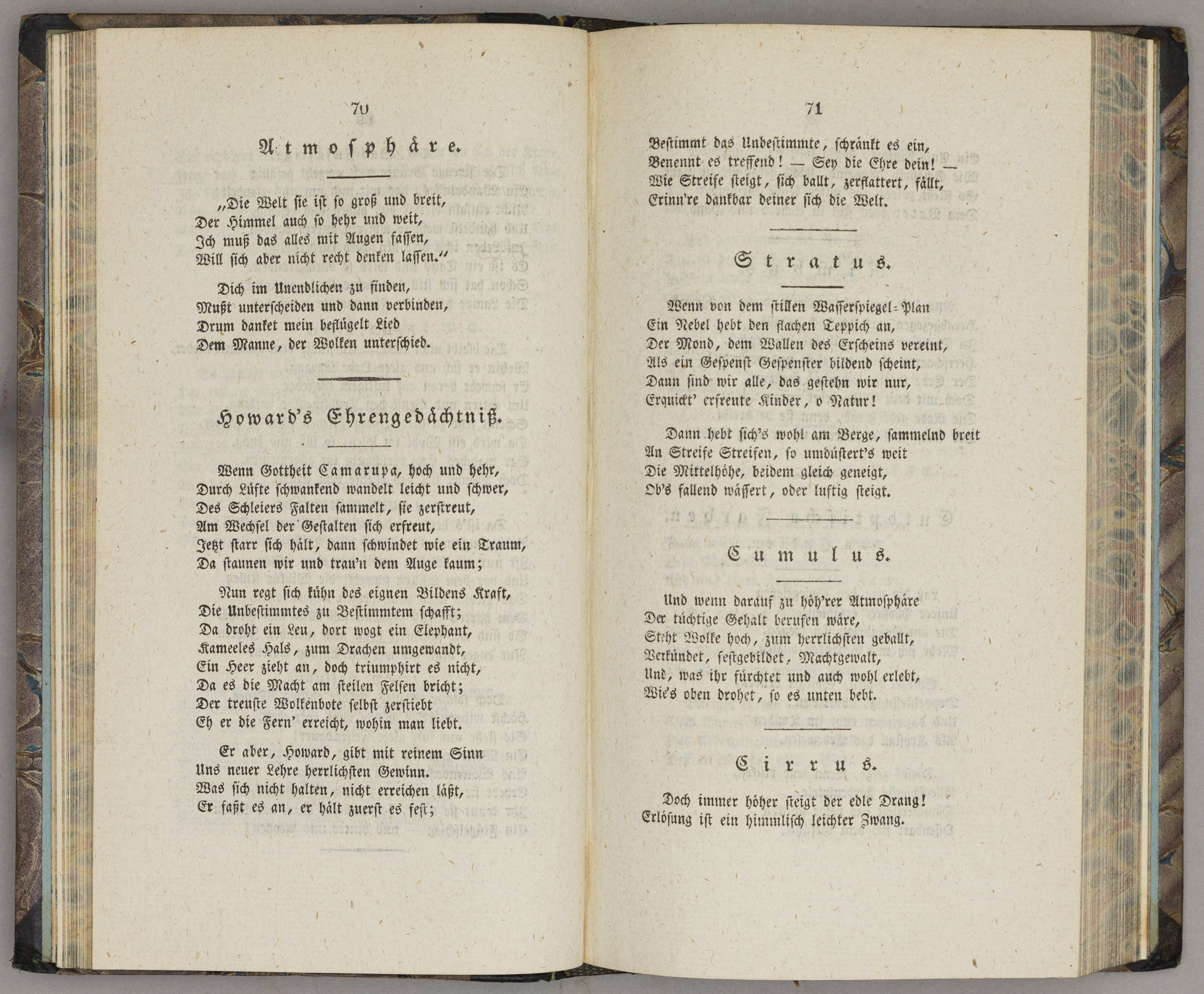 Goethe had a keen interest in studying nature and his studies inspired his poetry. He admired Luke Howard’s work for “bestowing form on the formless” and “creating a system of ordered change on a boundless world”. Several of his poems are dedicated to Howard’s cloud classification and one is even written in Howard’s honour (Howards Ehrengedächtnis). The two men also corresponded with each other. Howard sent Goethe a copy of The Climate of London in 1822.