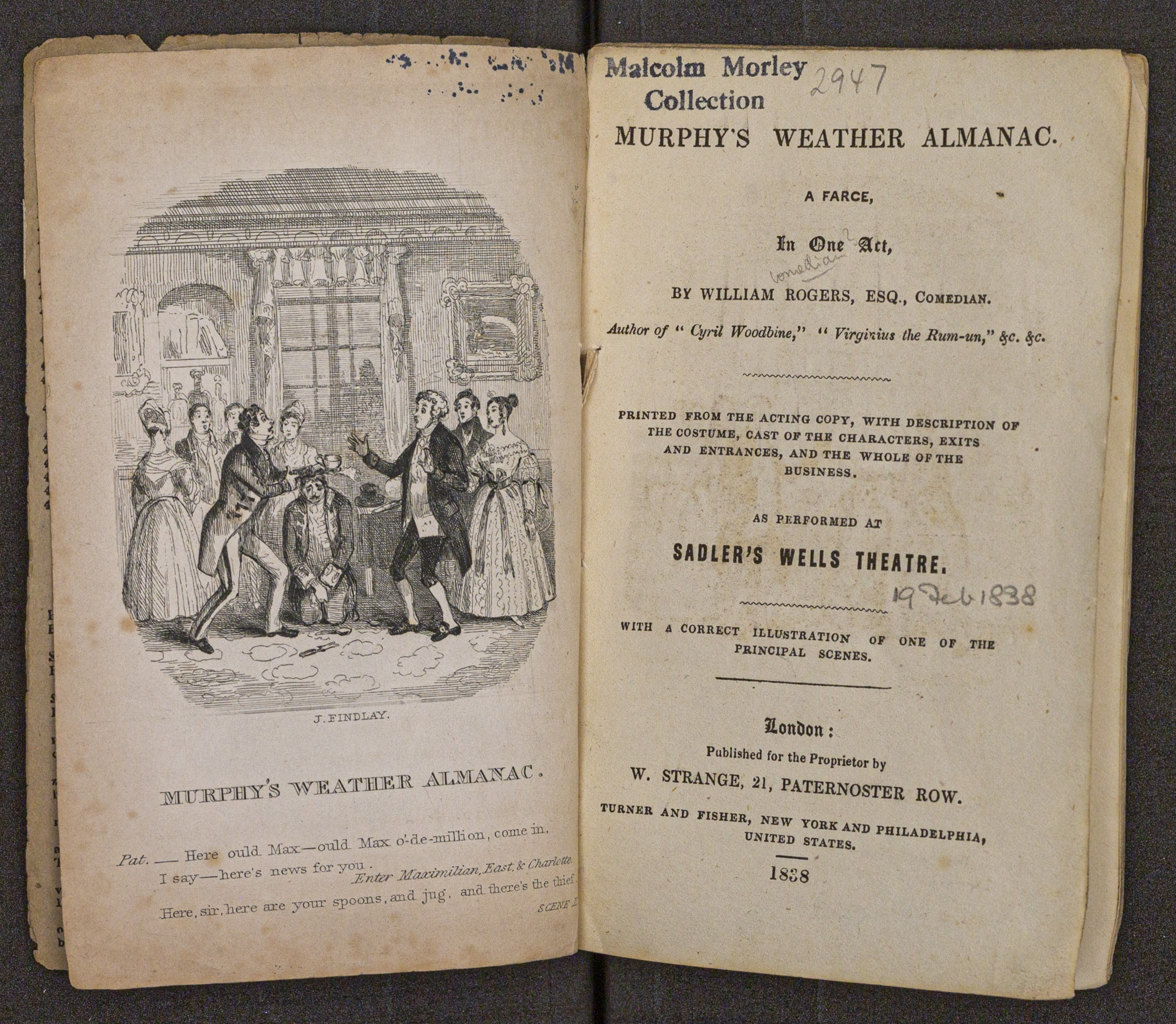 Murphy's weather almanac : a farce / by William Rogers, esq., comedian. ImprintLondon : Published for the proprietor by W. Strange, 1838. Descript.24 p. : ill. ; 15 cm. Malcolm Morley 2947 Collection MURPHY'S WEATHER ALMANAC. A FARCE, In One Act, lomedian BY WILLIAM ROGERS, ESQ., COMEDIAN. Author of " Cyril Woodbine," " Virgirius the Rum-un," &c. &c. PRINTED FROM THE ACTING COPY, WITH DESCRIPTION OF THE COSTUME, CAST OF THE CHARACTERS, EXITS AND ENTRANCES, AND THE WHOLE OF THE BUSINESS. AS PERFORMED AT SADLER'S WELLS THEATRE. 197b1838 WITH A CORRECT ILLUSTRATION OF PRINCIPAL SCENES. ONE OF THE J.FINDLAY. London: Published for the Proprietor by W. STRANGE, 21, PATERNOSTER ROw. MURPHY'S WEATHER ALMANAC. TURNER AND FISHER, NEW YORK AND PHILADELPHIA, UNITED STATES. Pat. Here ould Max-ould Max o-de-milion, come in. I say-here's news for you 1838 Here, sir, here are your spoons, and jug, and there's the thiei. SCENE Enter Maximilian, East, & Charlette.