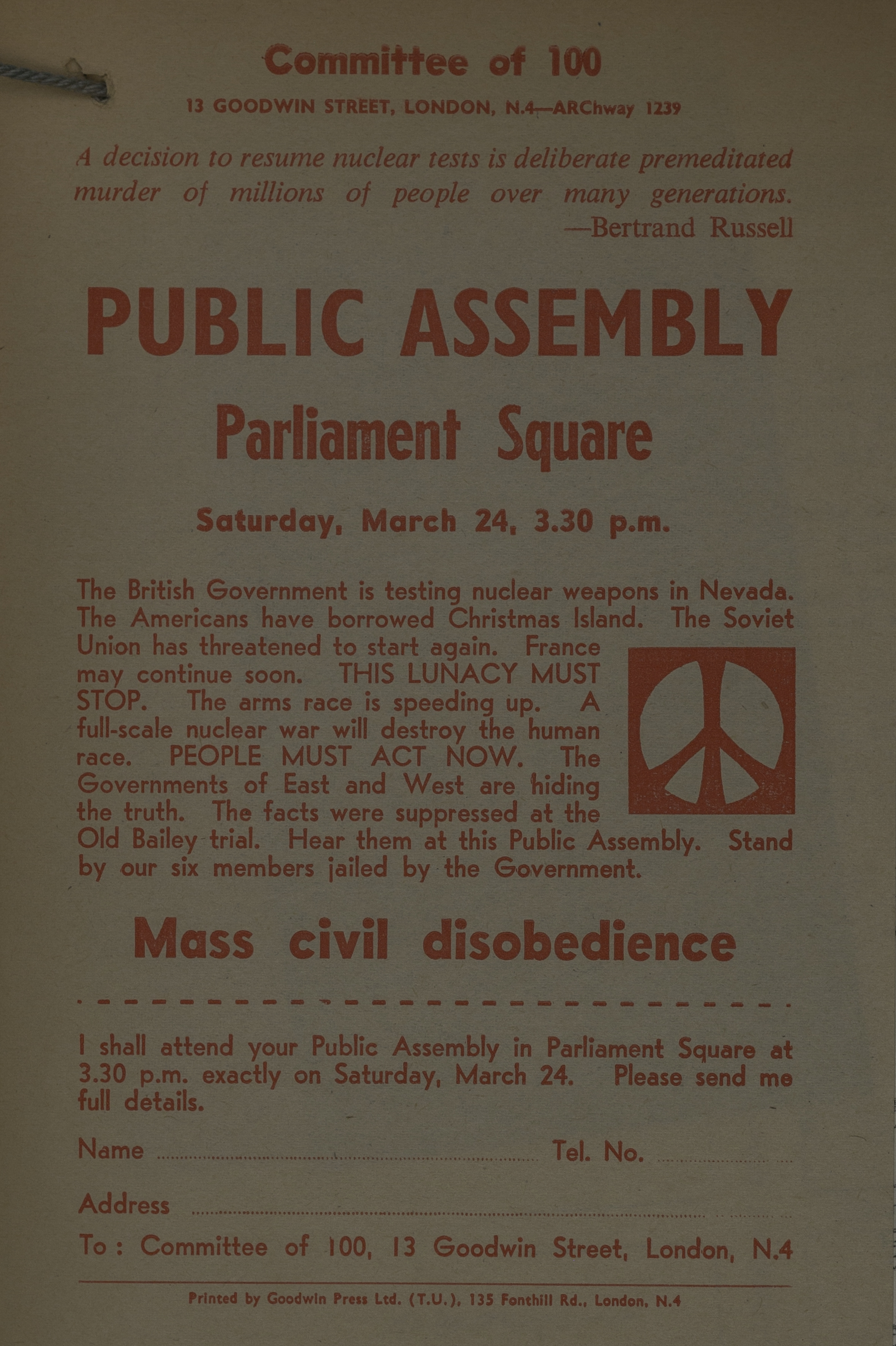 1961-1965. File title, "Committee of 100 incl. Industrial Sub. Cttee. “Voice of N.D.”. Includes papers of London Committee of 100, leaflets and reports about protests and demonstrations. Legal and general briefings for those taking part in non-violent demonstrations, civil disobedience, direct action. Requests for support at Old Bailey trials of protesters. Questionnaire for Committee of 100 Survey.