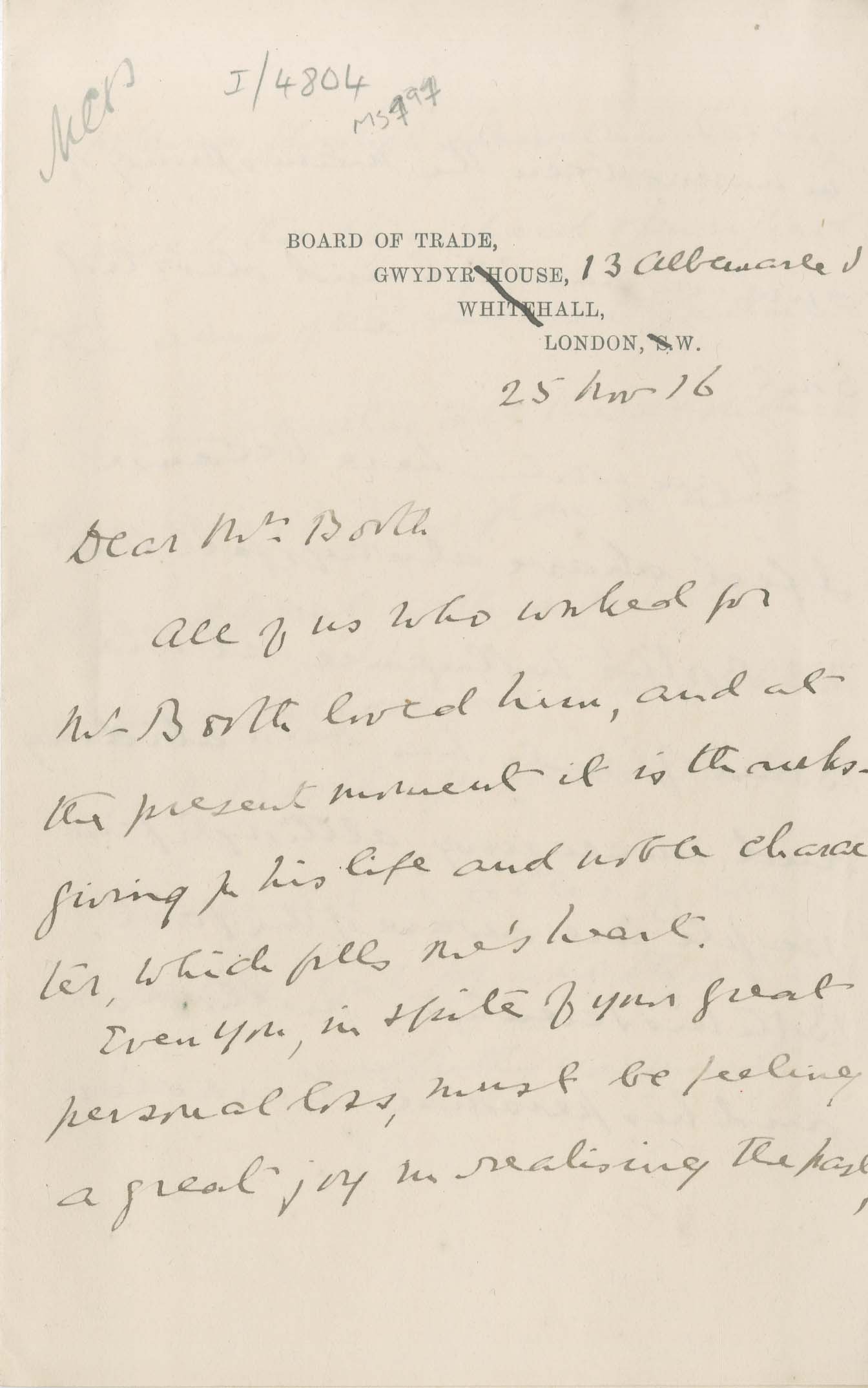 - Letter from Clara Collet to Mary Booth, signed, 25 Nov 1916.