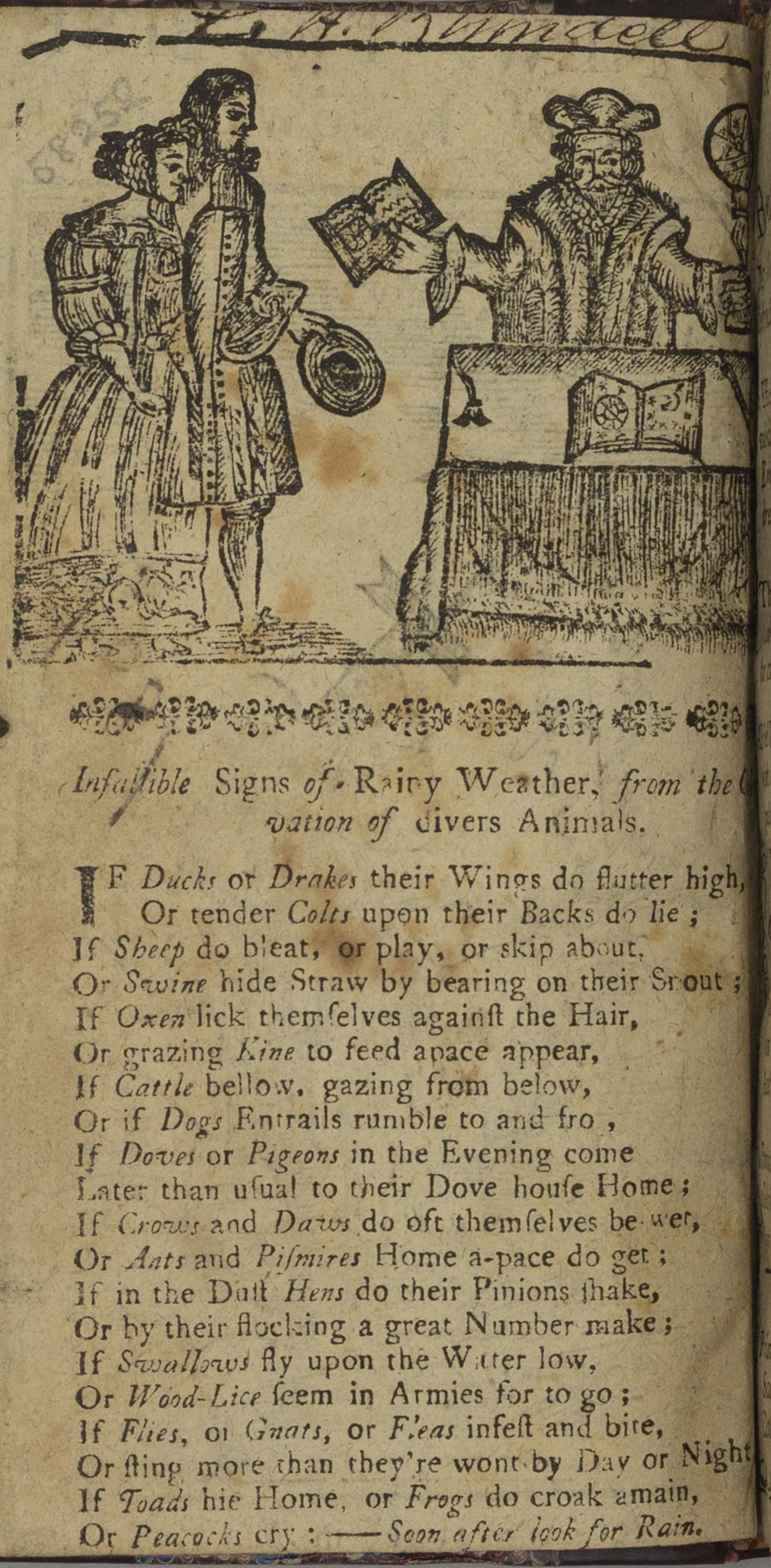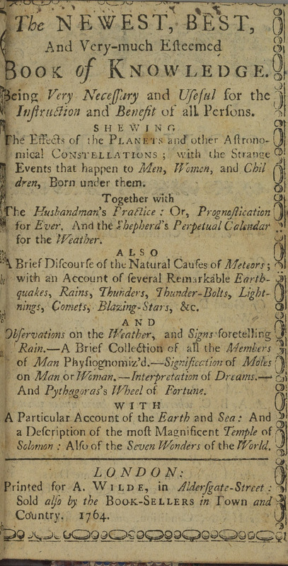 Printed for A. Wilde London, 1764 [Rare] N [Book] The weather is an important influence on everyday life, including agriculture and trade. This is why instructions about how to predict weather were highly valued. Advice on weather prediction was published in educational and instructional manuals. Although this book sells itself as the ‘newest’ and ‘best’ and includes references to Francis Bacon, it is still steeped in weatherlore. It lists how different animal behaviours can indicate the arrival of certain types of weather.