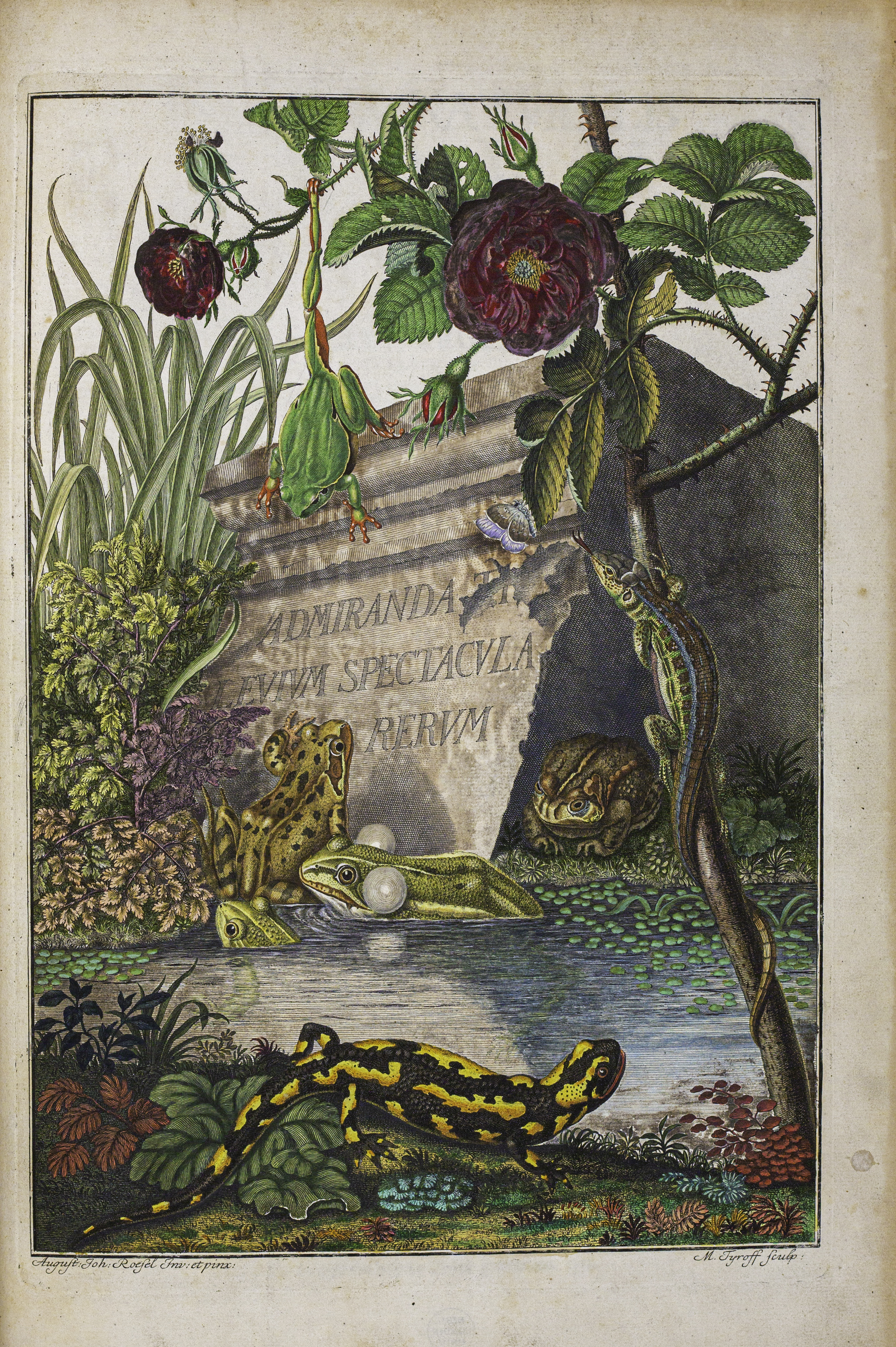 Frontispiece of August Johann Rösel von Rosenhof (1705-1759), Historia naturalis ranarum nostratium : in qua omnes earum proprietates, praesertim quae ad generationem ipsarum pertinent, fusius enarrantur = Die natürliche Historie der Frösche hiesigen Landes : worinnen alle Eigenschaften derselben, sonderlich aber ihre Fortpflanzung umständlich beschrieben werden / cum praefatione illustris viri Alberti v. Haller ; edidit accuratisque iconibus ornavit, Augustus Iohannes Roesel von Rosenhof (Norimbergae = Nürnberg : Typis Iohannis Iosephi Fleischmanni = Gedruckt bey Johann Joseph Fleischmann, 1758).