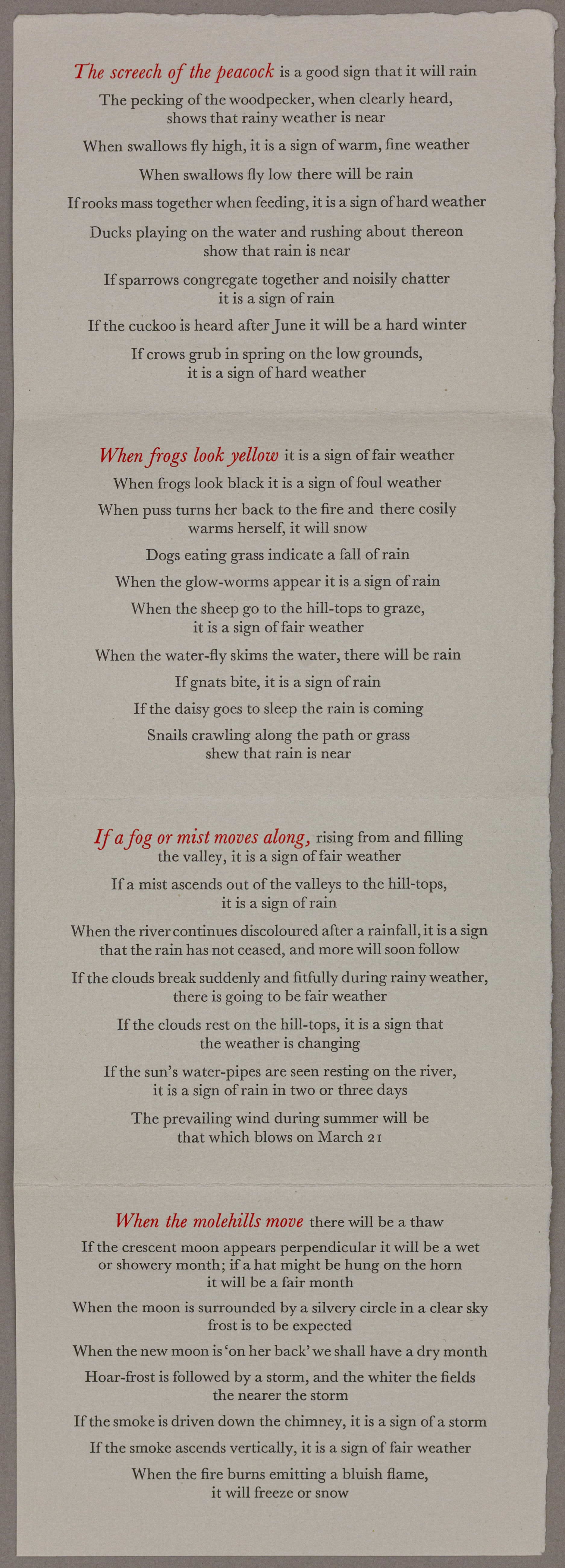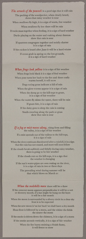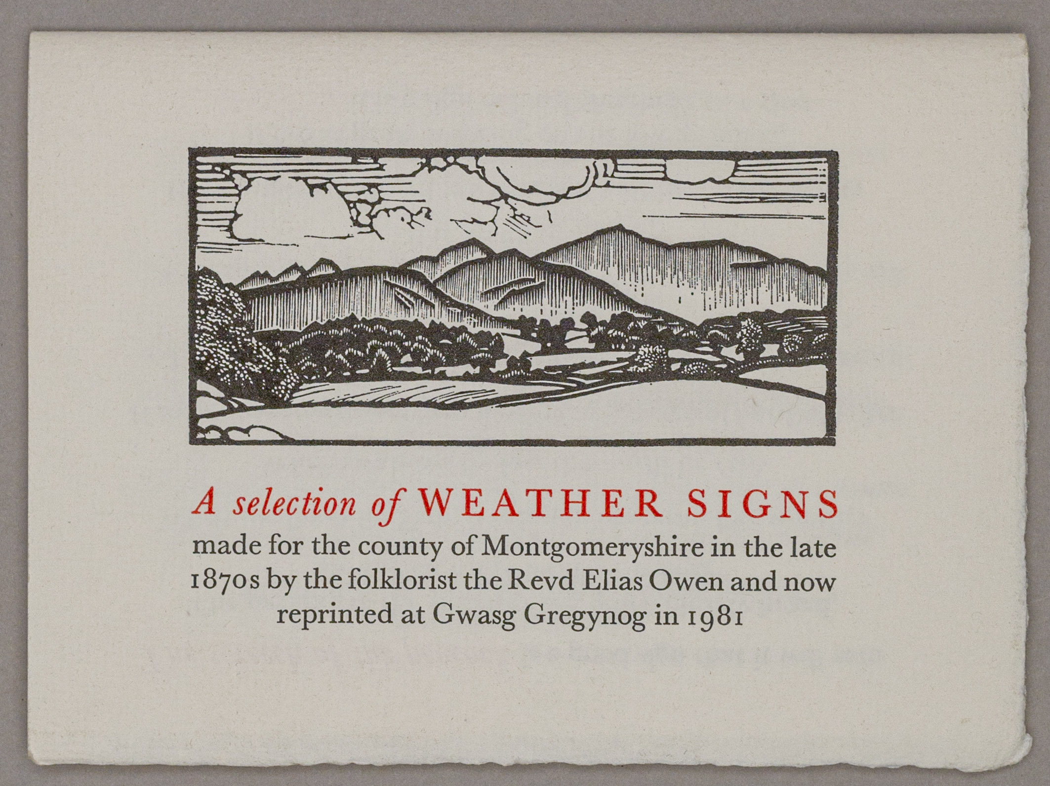 Gwasg Gregynog (The Gregynog Press) Newtown, Powys, reprinted 1981 [S.L.] III [Gregynog Press] (P.C.) Weather is fundamentally tied to local knowledge and woven into local tradition. Weather signs gave people ways to read their county’s natural geography such as: ‘If the mist ascends out of the valleys to the hill-tops it is a sign of rain’. These sayings were collected by the prominent collector of Welsh folklore Reverend Elias Owen and later reprinted by the Gregynog Press (Gwasg Gregynog) in Tregynon, Wales. The Press was founded by the sisters Gwendoline and Margaret Davies to produce artistic prints using traditional skills to celebrate Welsh culture.