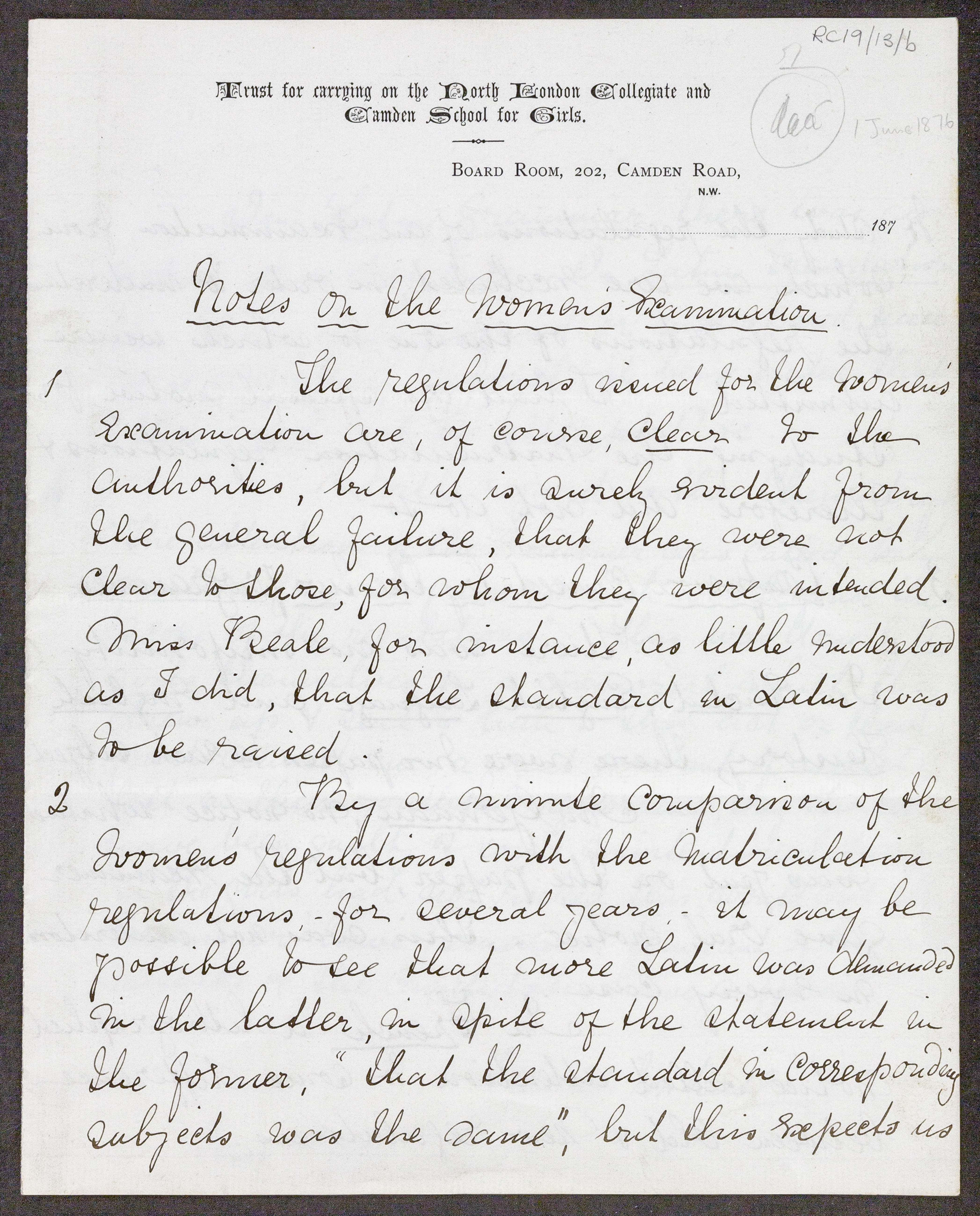 - Letters of France Mary Buss concerning observations arising from the UoL women's examinations 1st June 1876