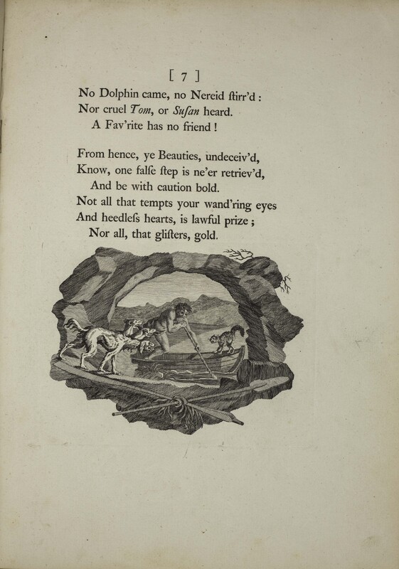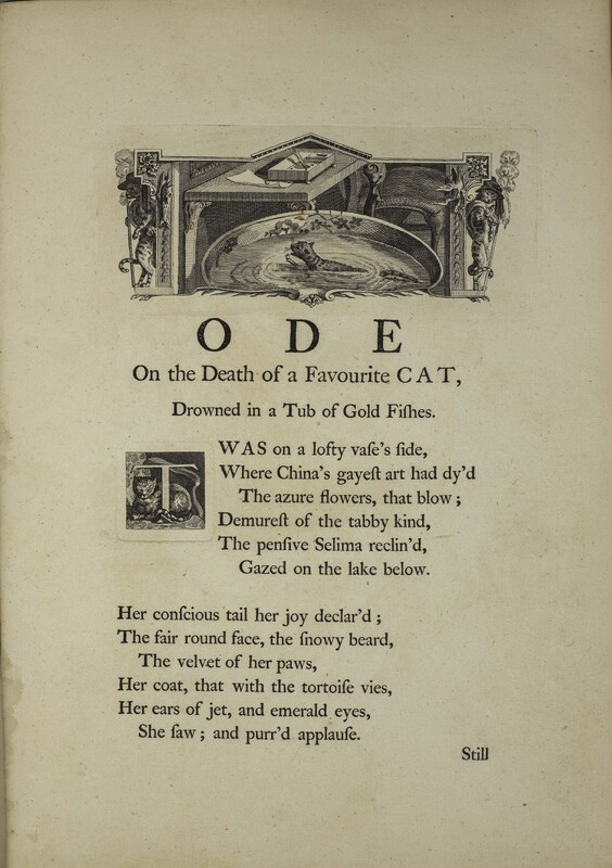 Page from Designs by Mr. R. Bentley, for six poems by Mr. T. Gray. In the Sterling Library, first and fine editions of English literature. Thomas Gray's tragicomic poem about the death of Horace Walpole's cat, Selima.