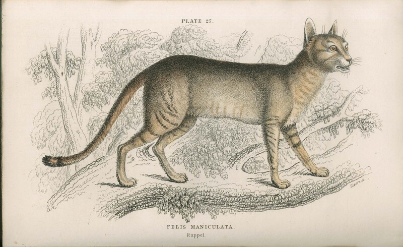 Plate from The natural history of the felinae ... by Sir William Jardine. In the Durning-Lawrence Library, items related to Sir Francis Bacon. According to Ruppel, 'This cat, must in more than one respect, excite the interest of natural philosophers, as there can be no doubt but that from it is descended the domestic cat of the ancient Egyptians' (pages 239-240).