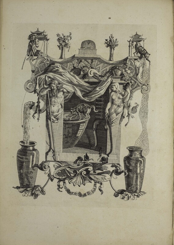 Plate from Designs by Mr. R. Bentley, for six poems by Mr. T. Gray. In the Sterling Library, first and fine editions of English literature. Depicts Thomas Gray's tragicomic poem about the death of Horace Walpole's cat, Selima.