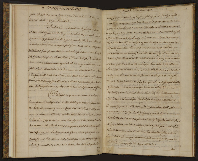 British colonial administrators’ reports reveal the relationship between climate, the empire’s economy and enslavement. Here the Governor of South Carolina, James Glen, reports to the Crown’s official organisation monitoring trade in the British colonies’ plantations. He describes indigo and rice as “excellent” export commodities due to the region’s subtropical climate and highlights how these valuable crops are managed to exploit enslaved labourers across seasons in both the American and Caribbean colonies.