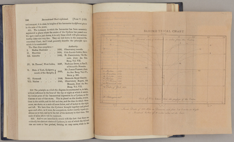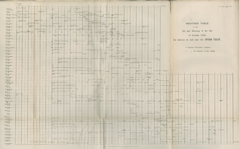 On 5th October 1864, a devastating cyclone destroyed the city of Kolkata (formerly Calcutta) claiming about 50,000 lives. In this report, Gastrell Eardley and Blanford attempted to trace its development through observations from ships and atmospheric pressure data gathered from often unreliable private letters and published accounts as visualised in this table. India was perceived as a perfect observatory of extreme but simplified weather and featured prominently in British meteorology, serving the Empire’s pursuit of ‘universal’ scientific knowledge.