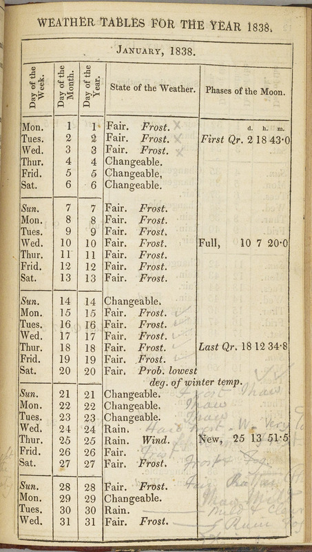 Almanacs were one of the biggest mass market products of their time. They are annual publications with information on subjects of daily use to their readers. In 1838 Murphy’s Weather Almanac correctly predicted that the coldest day of the year would fall on 20 January, which made its sales sore. An unknown annotator of this copy has checked its predictions for accuracy. Popular almanacs producing accurate knowledge posed a challenge to elite scientific meteorologists at the time.