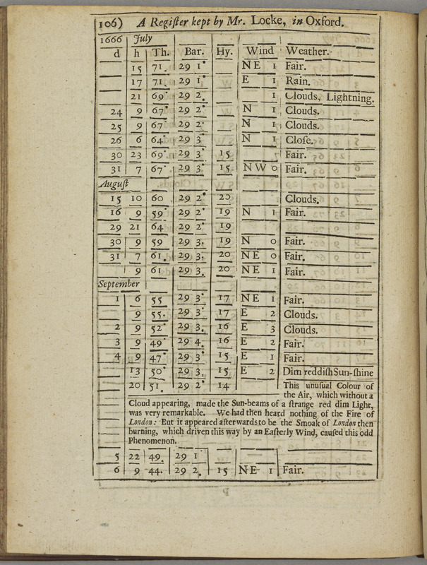 Standardised weather diaries were the answer to weather's elusiveness for the 17th century thinkers who embraced the experimental scientific method according to which data recording and analysis was essential for acquiring knowledge. One of the first modern chemists Robert Boyle persuaded his friend and fellow empiricist philosopher John Locke to start a weather diary in June 1666 with consistent recordings of atmospheric measurements such as temperature and pressure. On 4 September, Locke observed a “dim reddish sunshine” in Oxford, unknowingly describing the effects of the devastating Great Fire of London, which had started two days earlier.
