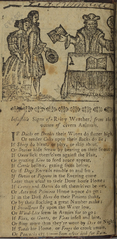 The weather is an important influence on everyday life, including agriculture and trade. This is why instructions about how to predict weather were highly valued. Advice on weather prediction was published in educational and instructional manuals. Although this book sells itself as the ‘newest’ and ‘best’ and includes references to Francis Bacon, it is still steeped in weatherlore. It lists how different animal behaviours can indicate the arrival of certain types of weather.