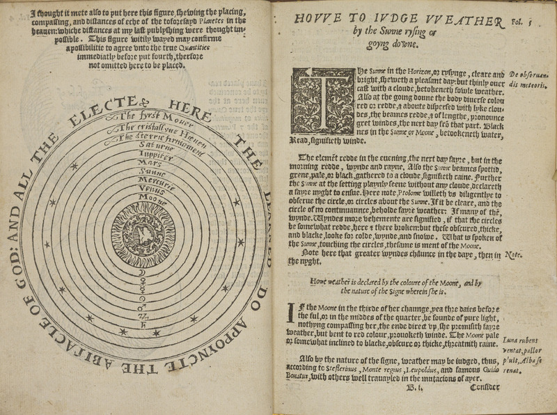 Weather lore and knowledge were disseminated in books such as The Knowledge of Things Unknown which has this woodcut image on its title page. It shows a figure looking up for guidance to the ancient Greek scholar Claudius Ptolemy who had a significant impact on mathematical and astronomical thinking in medieval and early modern Europe. The text compiles theories on the origin of different weather phenomena and gives guidance on how its user might “read” them with help of knowledge passed down by “ancient authorities”.
