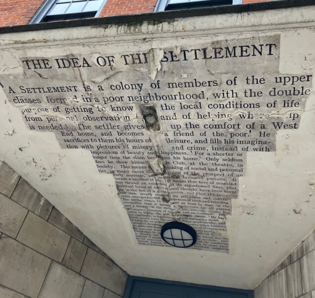 - A photograph of the text pasted up above one of the entries to Mary Ward Settlement House, taken August 2025. In the 1930s and 40s the Settlement made its rooms available to Austrian refugees (in particular) to meet together and discuss issues such as the post-war future of Austria - which was very much undecided until the Moscow Declaration in 1943.