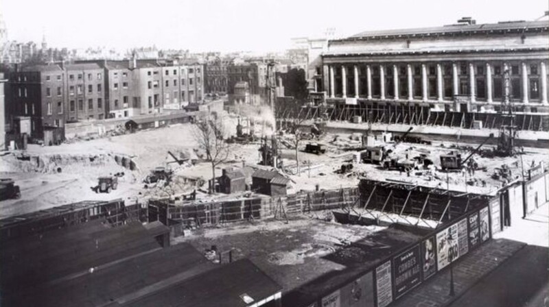 Imagine yourself here in Russell Square in 1935. The area looks rundown. There is smoke in the air and the buildings are black with soot residue. The once-fashionable terraced houses are mostly cheap boarding houses. The streets and squares are quiet. Apart from the British Museum to the South and UCL to the North, there are very few reasons to come to this area of London. But there are now big plans to develop the area into a University quarter: right here, they’re building Senate House to become the University of London’s headquarters - we're actually standing in a building site.