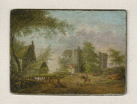 S. West’s Sale Warehouse, For Unredeem’d Pledges, Corner of Fann’s This object has two sides—and two uses. It was originally a engraved copper printing plate for the trade cards for an emporium selling unredeemed pawnshop goods. This use, producing ephemeral business cards, dates to around 1800. Around 1810, the valuable copper found a new purpose as the support for a miniature oil painting of a bucolic landscape complete with a thatched farmhouse, overgrown ruins, and cattle in the foreground.