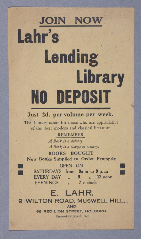 This leaflet advertises Esther Lahr’s lending library, run alongside the Progressive Bookshop in London. Closely connected to anarchist and left-wing intellectual networks, the library offered access to radical literature that was often difficult to obtain elsewhere. Modest in format yet purposeful in tone, the printed leaflet outlines borrowing terms while signalling the political commitments behind the enterprise. It reflects how the Lahrs combined bookselling, publishing and lending as part of a broader anarchist cultural project, creating a space where print became a tool for debate, education and dissent.