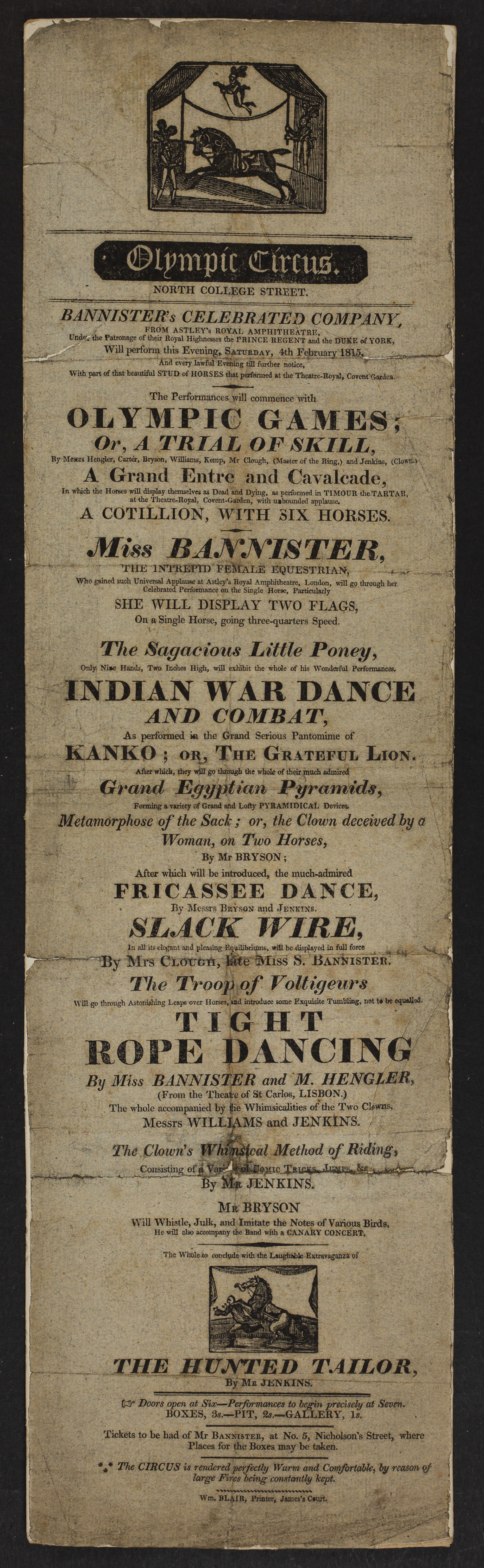 - James Bannister’s Equestrian Troup was one of the first touring circuses in Britain. From around 1810, the company toured Northen England and Scotland as the Olympic Circus, an offshoot of London’s Astley's Amphitheatre. This playbill is a rare survival that advertised a performance in Edinburgh in 1815. Bannister’s daughters were stars of the show, performing on the tight rope, slack wire and on horse back.