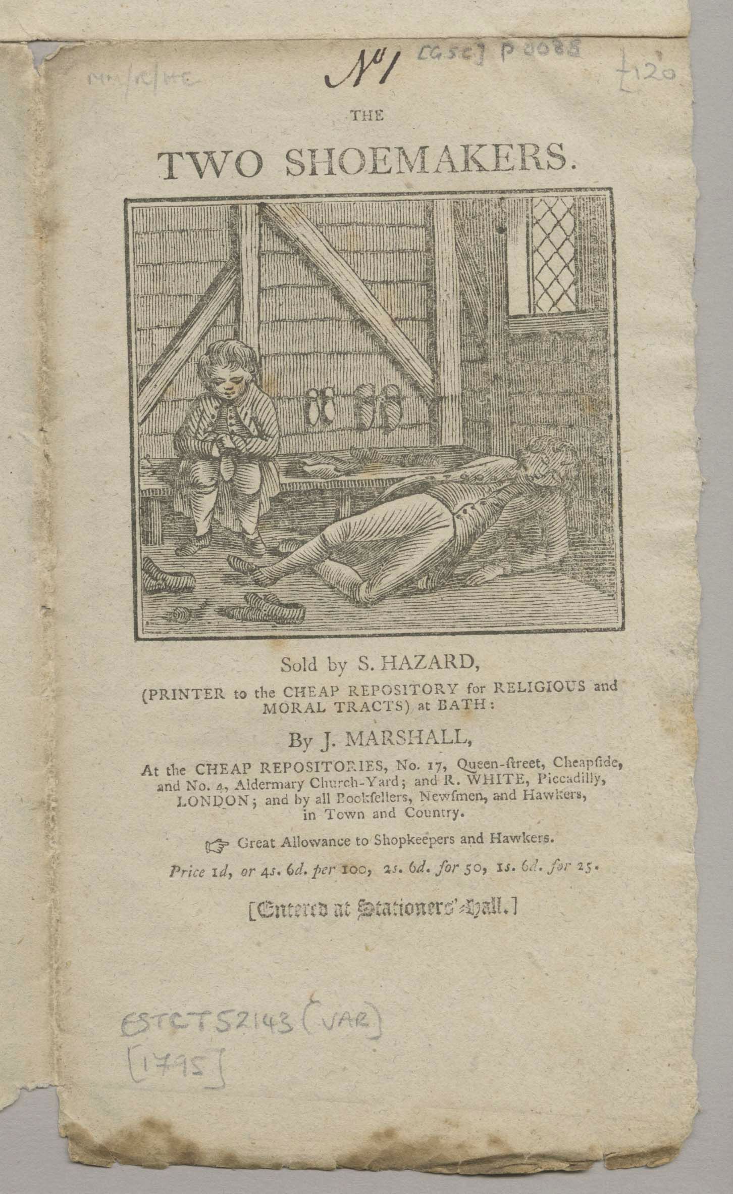 'The Two Shoemakers' is a moral tale by writer and educator Hannah More, published as part of her Cheap Repository series—an initiative of inexpensive publications aimed at the literate poor, offering an alternative to radical, seditious, and immoral cheap print. The pamphlet was written by More herself and printed by the series’ first printer, Samuel Hazard, based in Bath. It was distributed by Hazard and John Marshall in London, as well as by “all booksellers, newsmen, and hawkers, in town and country.” The initial run of the series, printed by Hazard in 1795, sold hundreds of thousands of copies. To meet growing demand, printing was soon moved to Marshall’s larger operation.