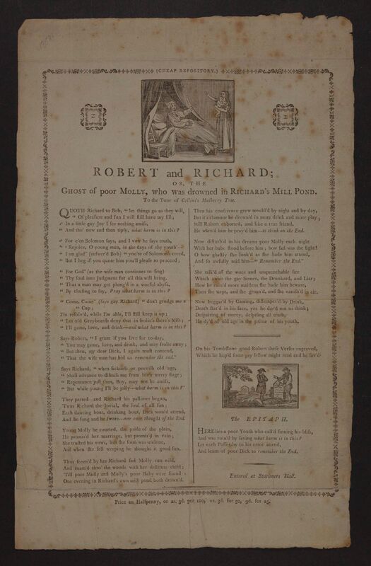 The Cheap Repository Tracts were a series of inexpensive religious, moral, and political publications—including tracts, ballads, and chapbooks—created by the writer and educator Hannah More. Aimed at the literate poor, they were produced in response to the radical and revolutionary literature circulating in England after the French Revolution, as well as to the rise of “immoral and vulgar” popular fiction. Robert and Richard is a cautionary ballad that warns of the dangers of sin.