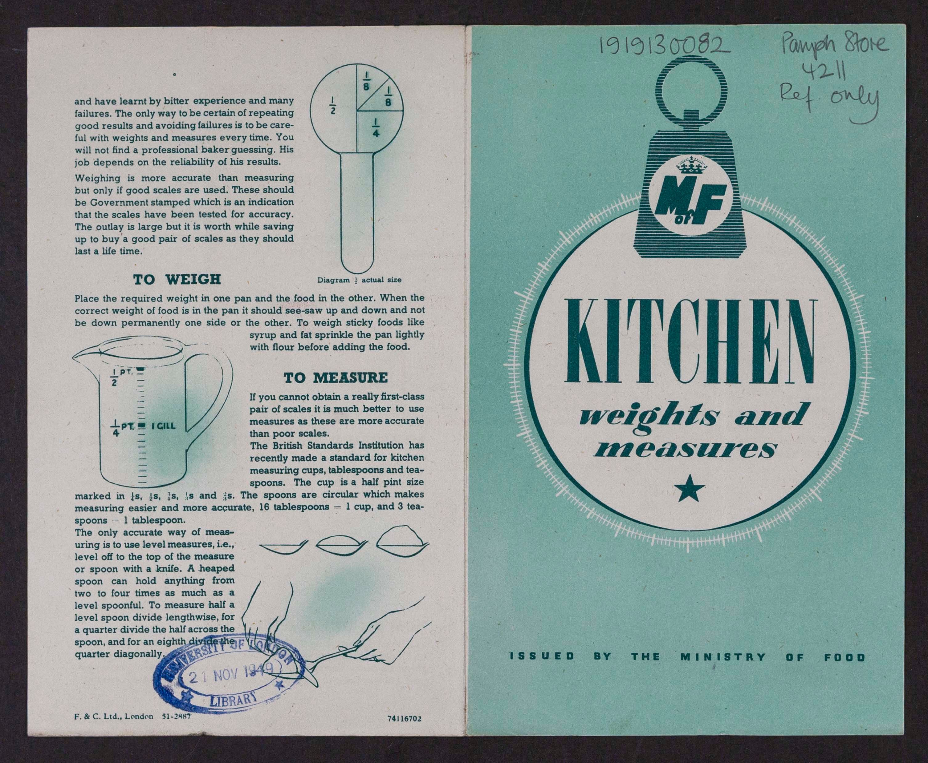 One of three leaflets from a series of guides produced by the Ministry of Food during and after the Second World War. The leaflets offered advice on healthy eating and nutrition, cooking for oneself, frugal approaches to food preparation, and a wide range of information related to food supply and rationing. This leaflet provides invaluable guidance on weights and measures, giving both volume and ounce equivalents for a range of common ingredients.