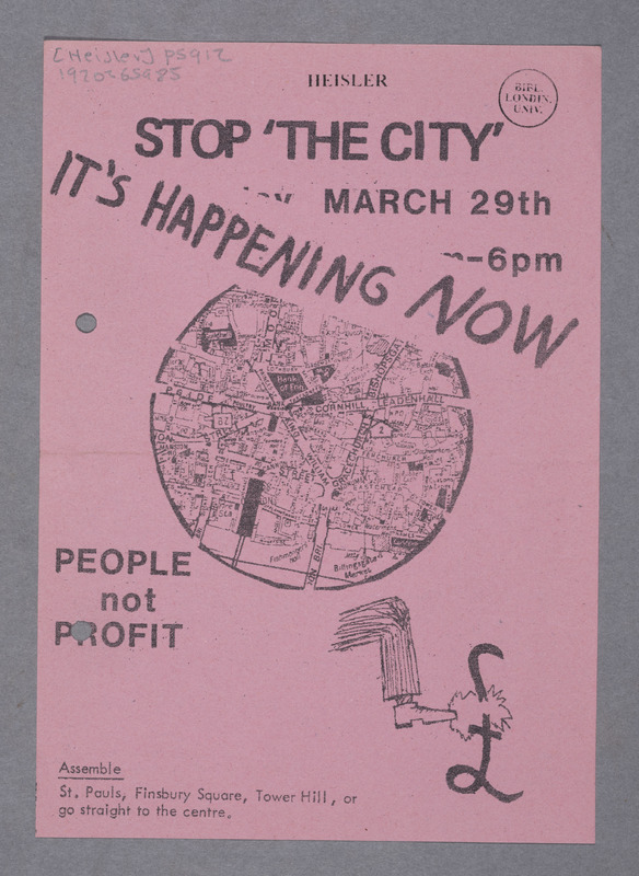- This flyer publicised the Stop the City protest in March 1984, a grassroots demonstration against capitalism and financial institutions in London. Featuring illustrations and a map, it symbolises direct action challenging the economic and political power of the City.