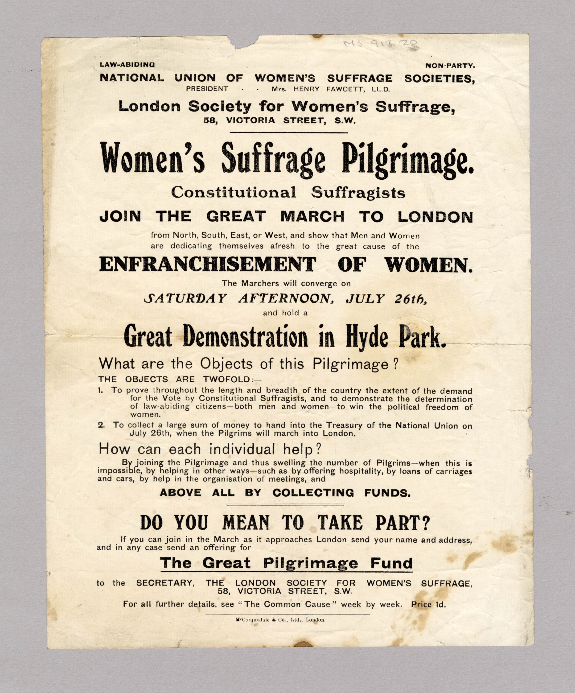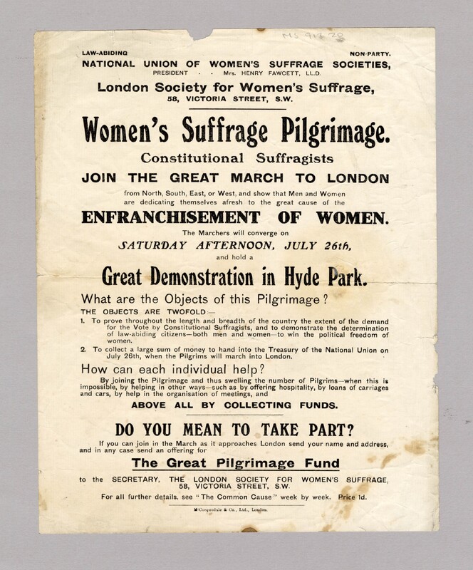 This flyer, issued by the National Union of Women’s Suffrage Societies (NUWSS), advertises the Women’s Suffrage Pilgrimage of July 26th, 1913. Organised by constitutional suffragists under the leadership of Mrs. Henry Fawcett, the march brought women from across England and Wales to London, converging in Hyde Park for a mass demonstration. Unlike the militant tactics of the suffragettes, the NUWSS emphasised law-abiding, peaceful protest to prove widespread public support for women’s enfranchisement. The flyer calls for participation, hospitality, and crucially funds, embodying the collective effort and determination behind the campaign for political equality.