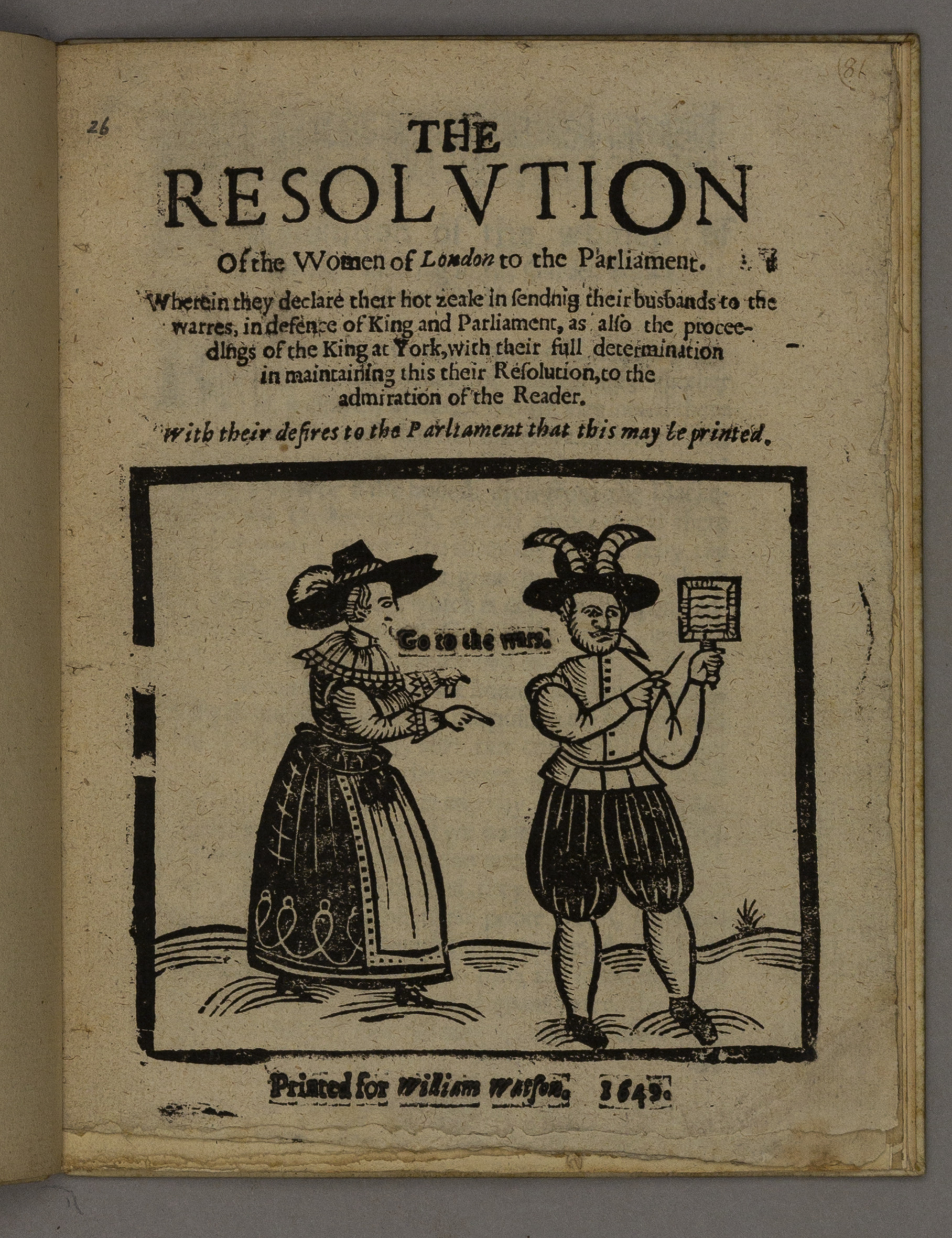 This pamphlet was printed at the start of the First Civil War. It satirises the fervent enthusiasm of women who urged their unreliable husbands to take up arms in support of the King. On the cover is a striking woodcut print of a woman encouraging her husband—using an early version of a speech bubble—to “go to the wars.” He is shown with cuckold’s horns on his head, ignoring her as he focuses instead on a hornbook, a small paddle‑shaped board with a printed lesson sheet, usually used to teach children.