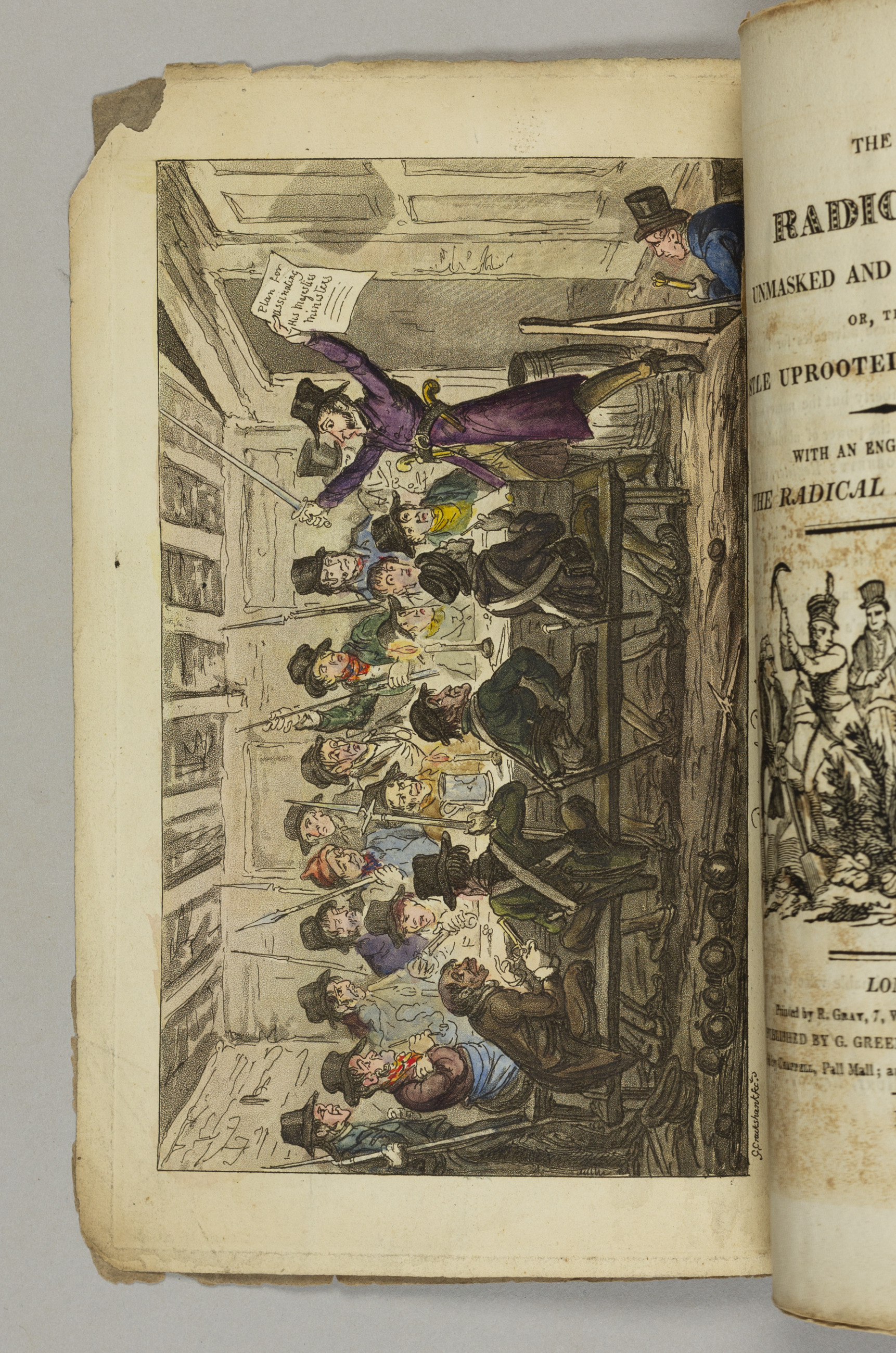 An anti‑radical poem, published in 1820, celebrating the discovery and arrest of a group of revolutionary radicals. In February of that year, the group plotted to assassinate Prime Minister Lord Liverpool and his cabinet as a first step toward overthrowing the government. The conspirators had been involved in earlier riots and were motivated by outrage over the Peterloo Massacre and the repressive Six Acts—legislation aimed at quelling dissent through measures such as banning “seditious” meetings and taxing pamphlets to restrict radical ideas. The pamphlet attacks prominent radical politicians and activists, and warns against the conspirators’ violent aims. Its coloured frontispiece by George Cruikshank vividly depicts the conspirators preparing for revolution.