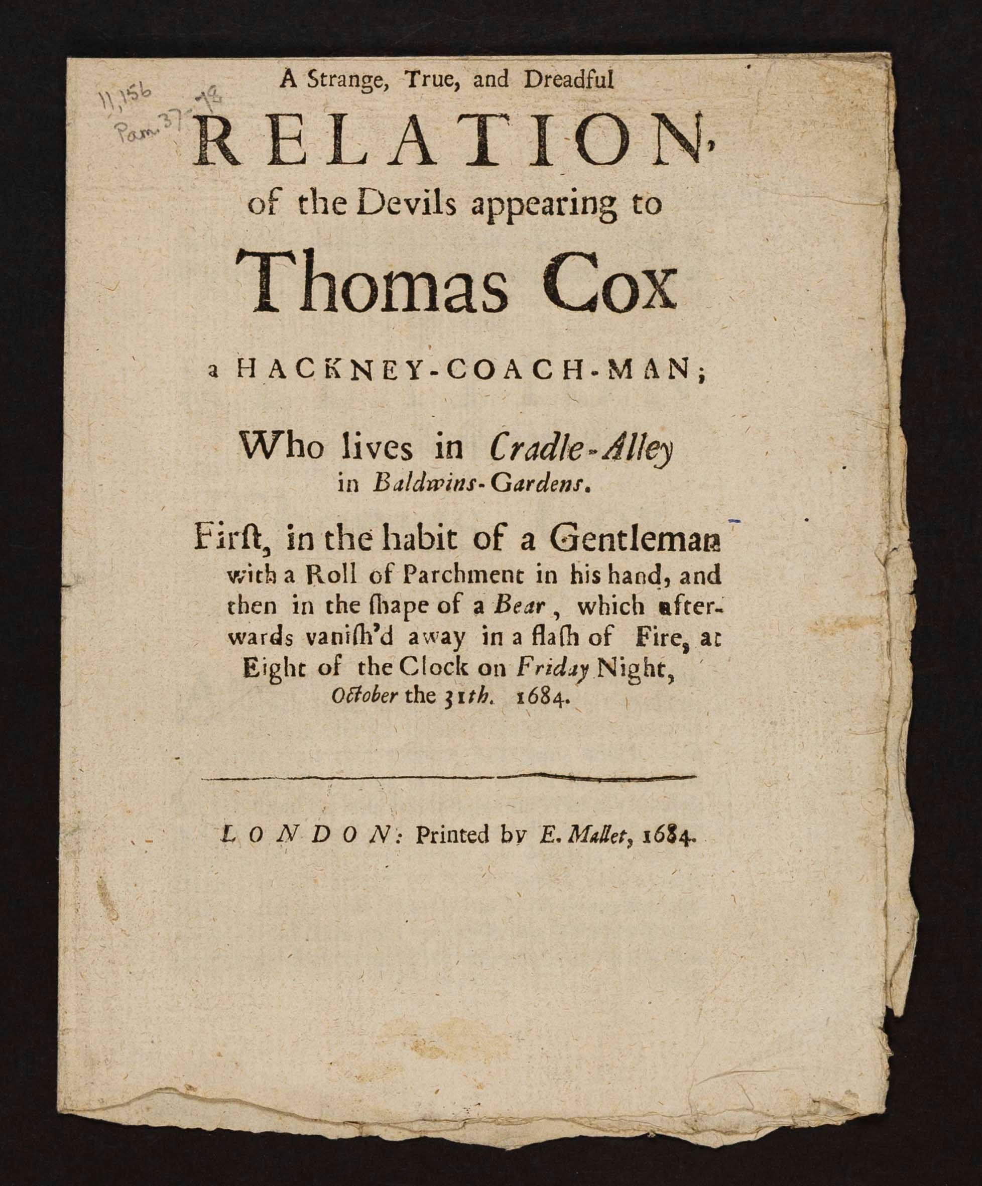 A Strange, True, and Dreadful Relation, of the Devils Appearing to Thomas Cox a Hackney-coach-man, Who Lives in Cradle-Alley in Baldwins-Gardens
