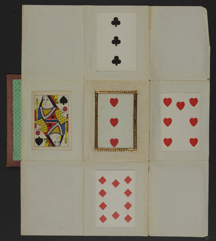 Paper novelties took many forms in the 19th century, from paper dolls to magic tricks. This curious item combines eight printed playing cards with a gold‑coloured frame attached to two sheets of paper. It was likely a variation on parlour tricks in which cards appear and vanish within a framed window. It bears the stamp of J. Robinson & Sons, Importers of Scientific Novelties, 172 Regent Street, London. Robinson was a dealer in photographic equipment and does not appear to have traded extensively in magic props.