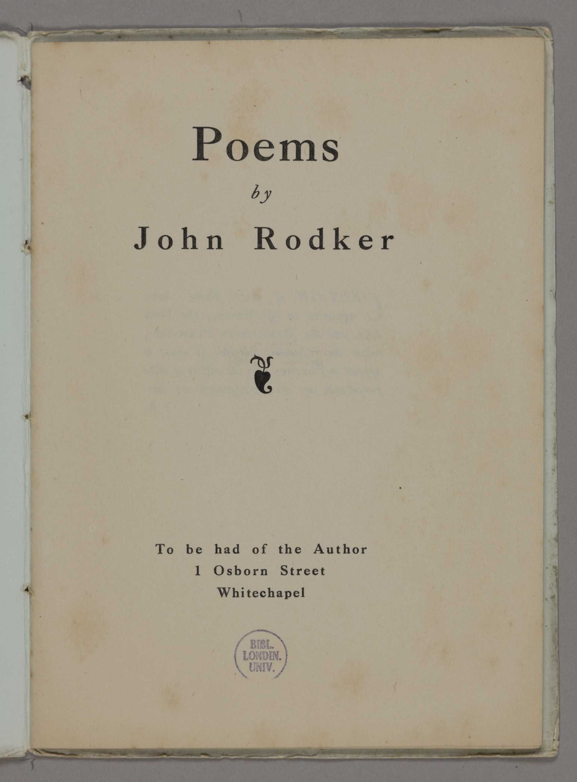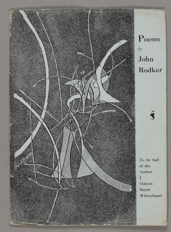 Modernist writer, publisher, and translator John Rodker was one of what is today called ‘The Whitechapel Boys’ group of writers and artists. In 1914, Rodker self-published and distributed his first collection, 'Poems', as a pamphlet, complete with cover art by fellow Whitechapel Boy, painter David Bomberg. The words “To be had of the author” followed by Rodker’s home address are printed on the title page.