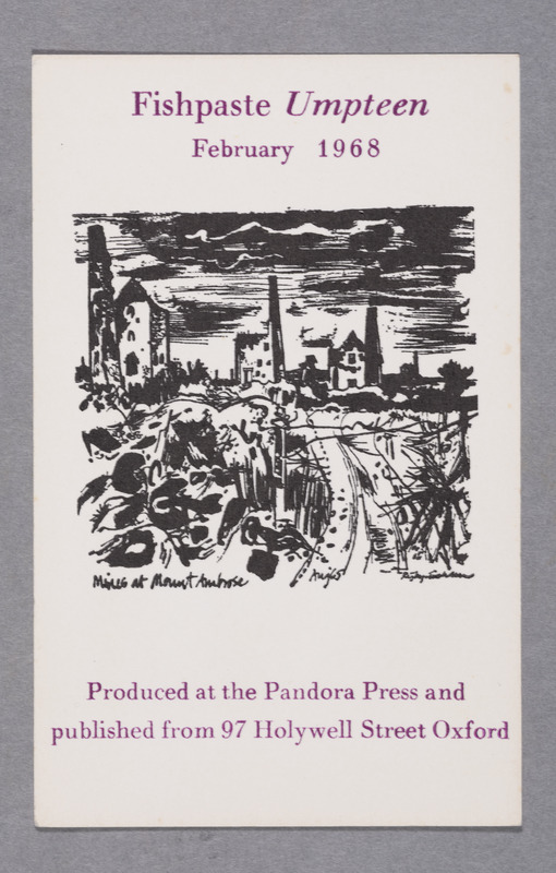 Printed on postcards (or postcard sized paper) which fitted in a table top Adana printing press, this ‘review of art and letters’ ran for two years on a monthly schedule. Printed at the Pandora Press by Rigby Graham, Toni Savage and Peter Hoy, each postcard contained a poem on one side and an illustration, usually by Rigby Graham, on the other. The title 'Fishpaste' was chosen as the contents of each issue were a surprise.