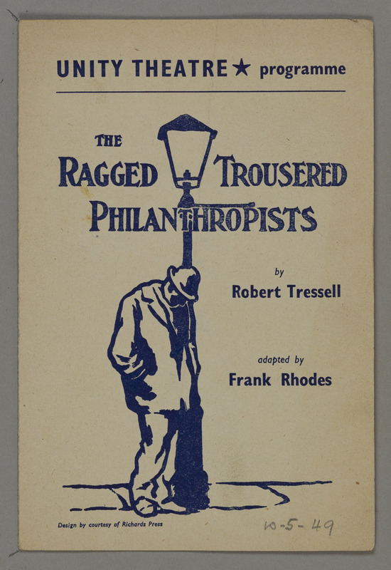 This programme, issued by the Unity Theatre around 1949, announces a stage adaptation of Robert Tressell’s landmark novel 'The Ragged Trousered Philanthropists' by Frank Rhodes. The novel, first published in 1914, vividly depicts the struggles of working-class painters and decorators, exposing exploitation and inequality in Edwardian England. By staging it, Unity Theatre brought Tressell’s socialist message to contemporary audiences in post-war Britain. The modest three-page programme not only records cast and production details but also reflects the theatre’s enduring mission to connect political conviction with performance and to champion working-class voices on the London stage.