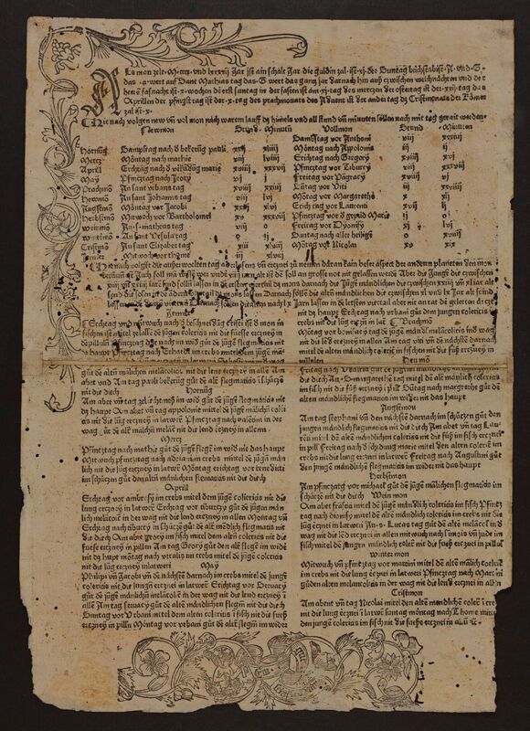 The earliest spineless item in this section is an almanac or calendar from 1491, when printing was new in Europe. Perhaps surprisingly, printers in the 15th century produced ephemeral material like this as well as Bibles and chronicles intended to last.
