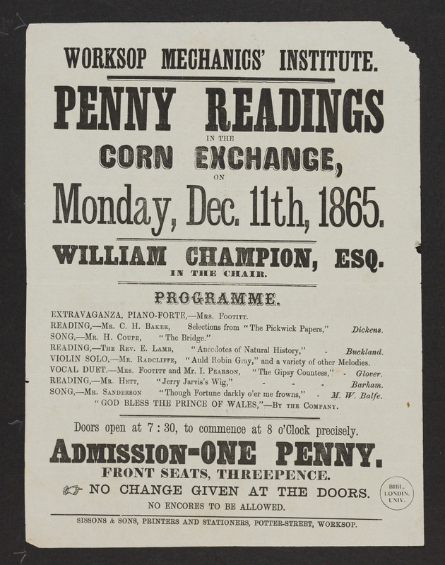 A distinctive 1925 leaflet promotes a lending service from the radical bookshop of Esther and Charles Lahr - and a provocative sign issues a warning to customers looking for ‘dirty’ books. A rare Victorian Penny Readings flyer, once folded for distribution, suggests ‘No encores to be allowed’. A 1942 Dolphin Book Company catalogue showcases another form of literary promotion: the trade in rare and second-hand pamphlets
